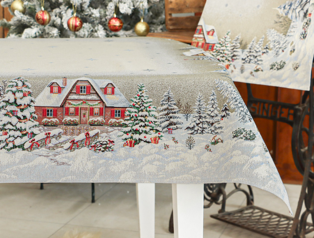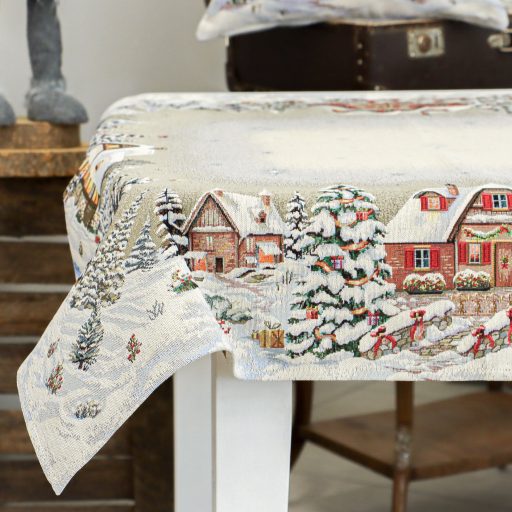 Varázsold asztalodat egy igazi téli mesévé! A részletgazdag mintán hófödte házikók, fenyőfák és erdei utak jelennek meg, amelyeket csillogó hópelyhek és ünnepi hangulatú részletek egészítenek ki. A középső világosabb, csillagmintás felület elegáns keretet ad a tálalásnak. Mérete ideális 4-6 személyes étkezőasztalokhoz. A prémium minőségű, gépi szövésű spanyol gobelin tartós és elegáns, így mindennapi használatra és ünnepi alkalmakra is tökéletes.