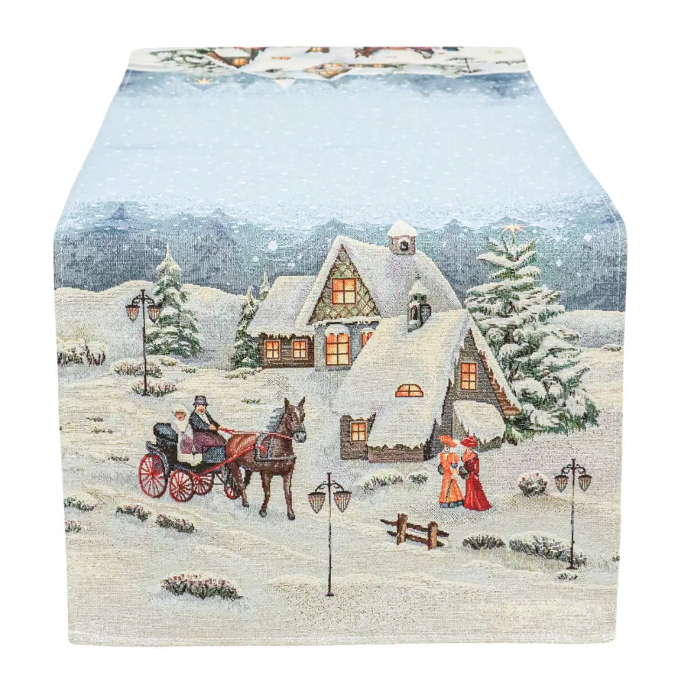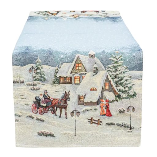 Ez a gyönyörű karácsonyi asztali futó igazi téli mesevilágot varázsol az ünnepi asztalra. Közepén hóeséssel borított égbolt található, míg a két végén aprólékosan kidolgozott, havas táj díszíti a terméket. A hóval borított házikók, lovaskocsik, és karácsonyi hangulatú jelenetek idilli, nosztalgikus atmoszférát teremtenek, tökéletesen illeszkedve az ünnepi asztalhoz. Esztétikus választás azoknak, akik szeretik a klasszikus, hagyományos karácsonyi dekorációkat.