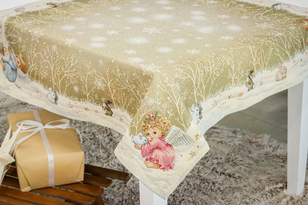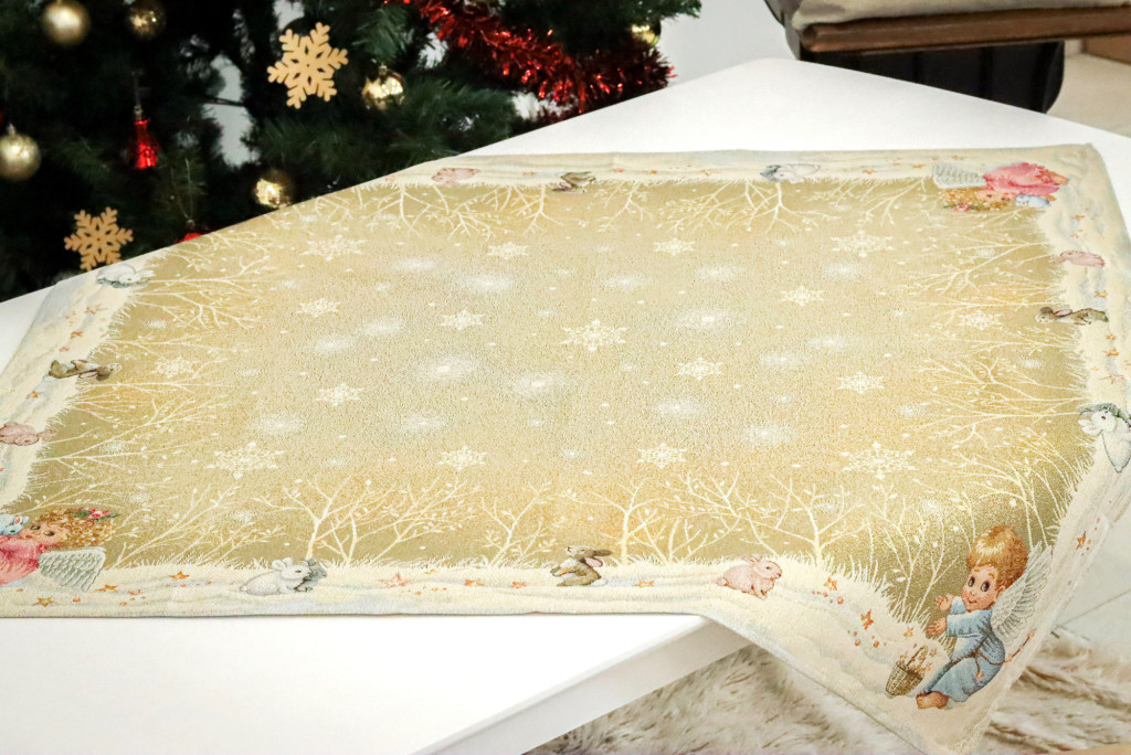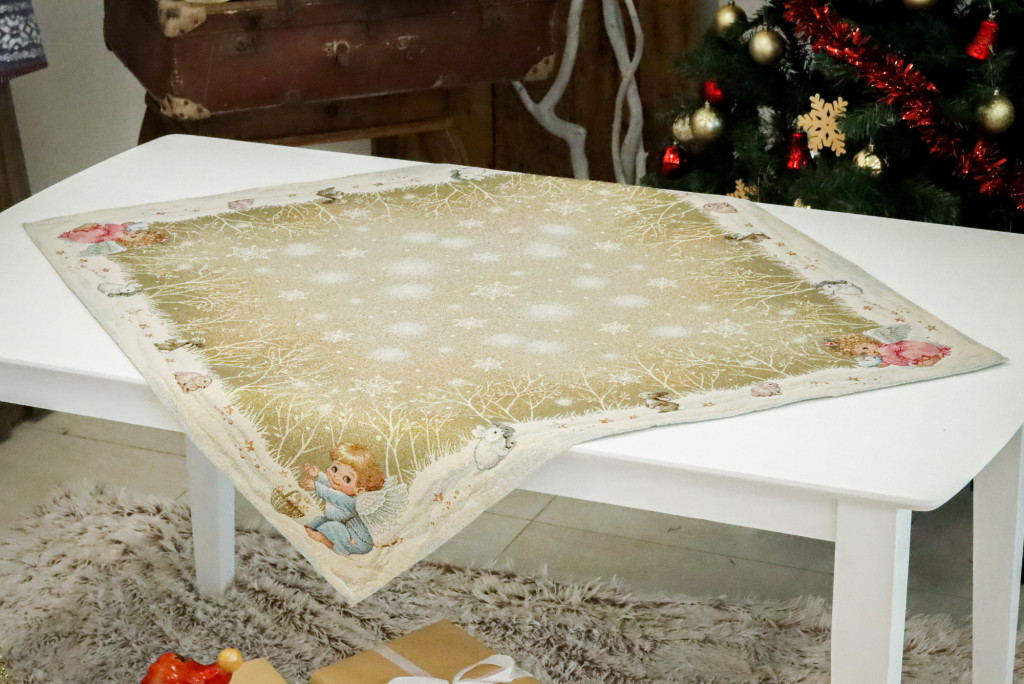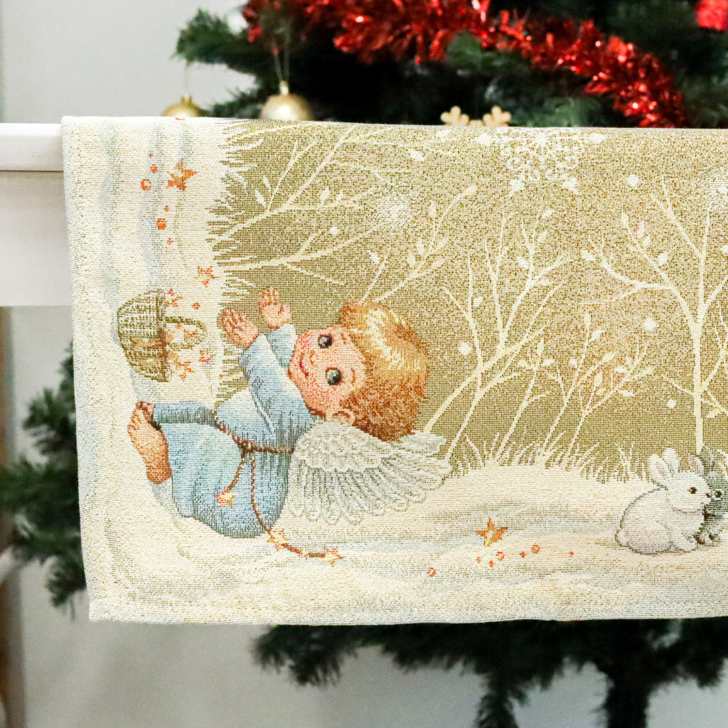 Angyalkákkal dekorált karácsonyi asztali futó, amely arany színű lurexxel van átszőve. Prémium minőségű termék, amely pompásan mutat az ünnepi asztalon. Megfelelő kezelés mellett hosszú éveking megőrzi szépségét és minőségét.