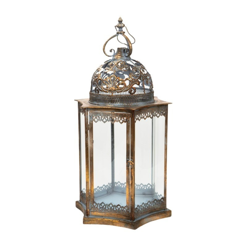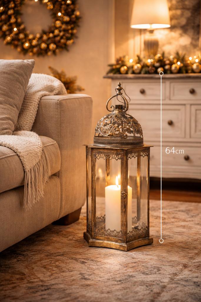 Elegáns, antikolt arany árnyalatú fém–üveg lámpás, finoman áttört díszítéssel. Gyertyával vagy LED fénnyel használva meleg, hangulatos fényt ad. Felakasztható vagy stabil talpán elhelyezhető.
