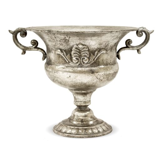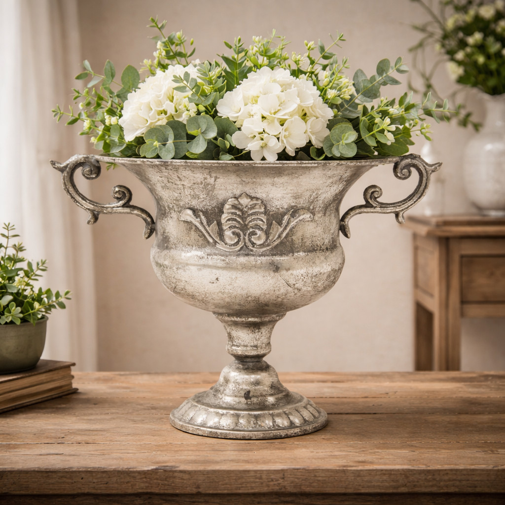 Ez az antikolt hatású fém virágtartó időtálló eleganciát kölcsönöz bármely enteriőrnek. Díszes fülei és patinás felülete exkluzív megjelenést biztosít, így tökéletes választás friss vagy művirág kompozíciókhoz, de önmagában is karakteres dekoráció. Ideális komódra, étkezőasztalra vagy konzolasztalra.