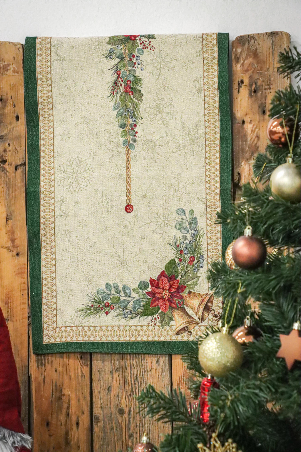Csengőkkel, csipkebogyókkal, koszorúkkal dekorált karácsonyi asztali futó. Anyaga vastag gépi gobelin, arany lurexes csillogása teszi igazán ünnepi hangulatúvá. Prémium minőségű termék, amely pompásan mutat az ünnepi asztalon. Megfelelő kezelés mellett hosszú évekig megőrzi szépségét és minőségét.