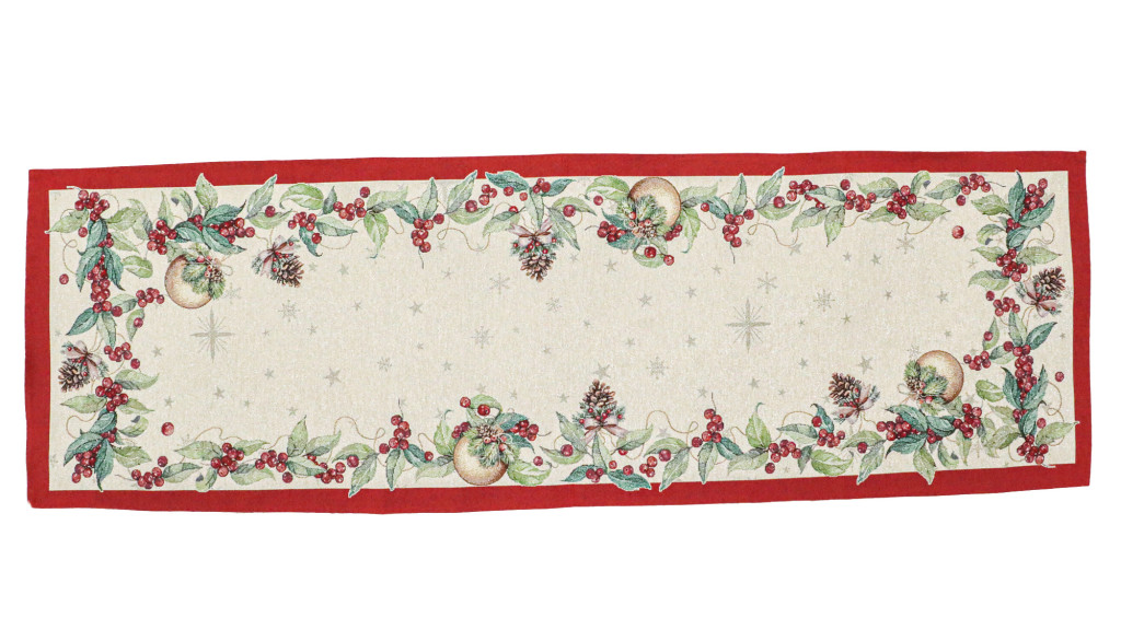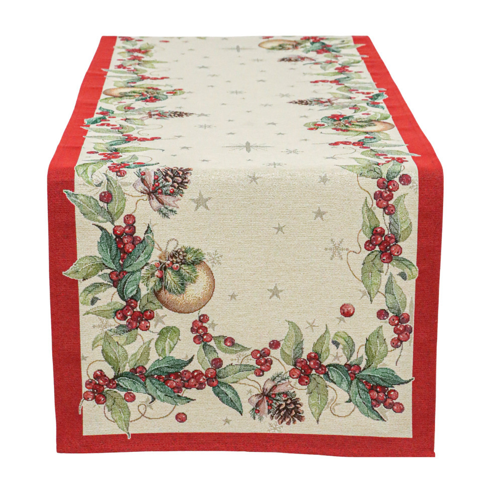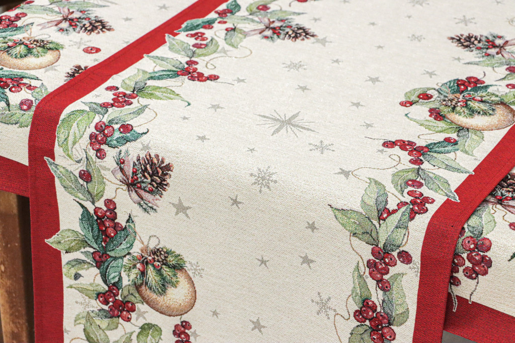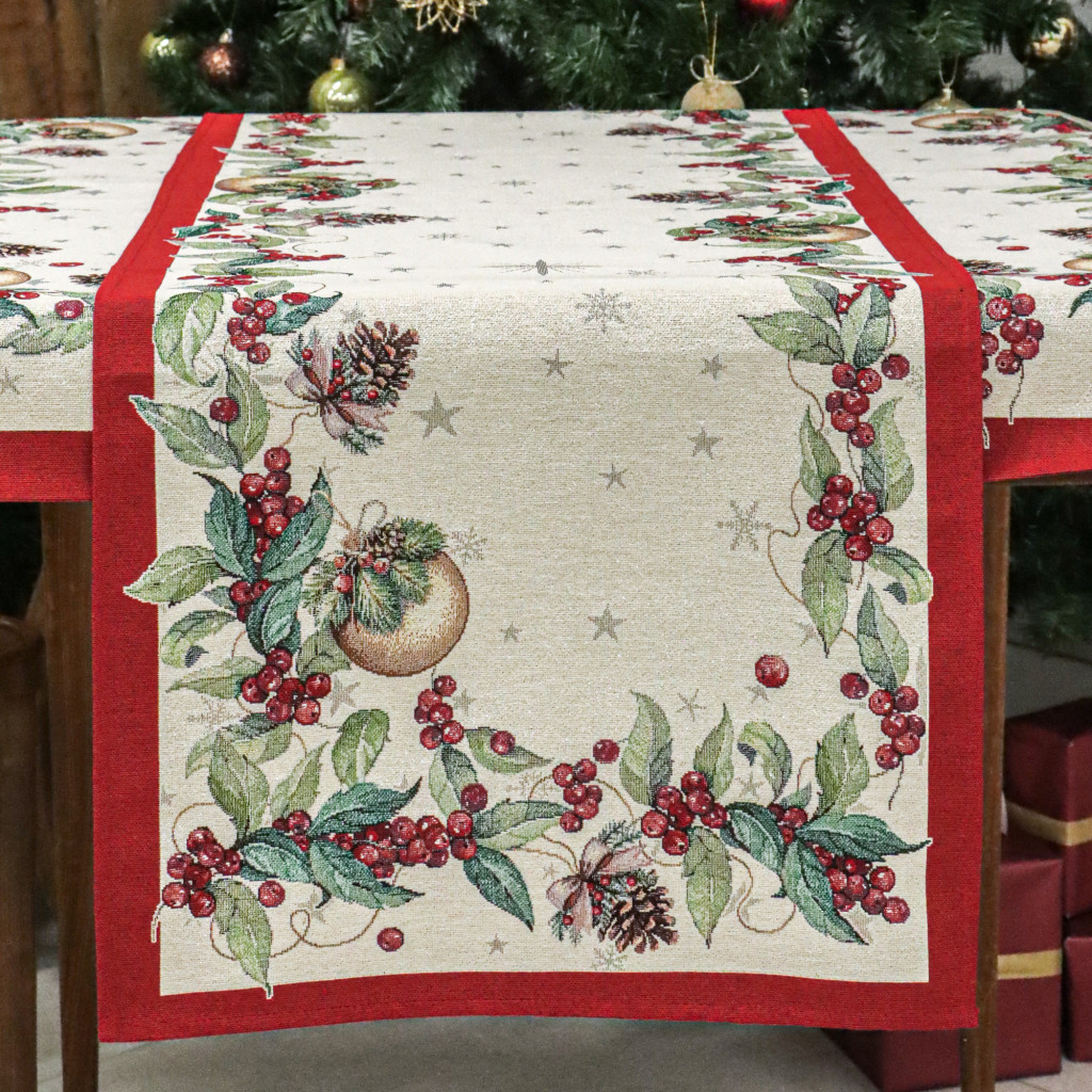 A Berry kollekció asztali futója kiváló választás karácsonyi vacsorákhoz, családi összejövetelekhez vagy akár ajándékként is remek ötlet lehet. Minőségi anyaga biztosítja, hogy az ünnepek hosszú éveken át emlékezetesek legyenek. A széleket fenyőtobozok, piros bogyók, zöld levelek és aranyszínű karácsonyfadíszek díszítik, amelyeket piros keret vesz körül. A természetes ünnepi elemek harmóniája tökéletesen kiegészíti az ünnepi dekorációkat, megteremtve a karácsony varázslatos hangulatát.