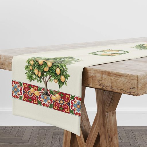Dobd fel az étkezőasztalt vagy komódot ezzel a stílusos, gép szövésű mediterrán asztali futóval, amely melegséget és eleganciát visz otthonodba! A futó sarkaiban érett citromokat hozó fák jelennek meg, míg a szegélyeken élénk piros mozaikcsempék és részletgazdag díszítőminták teszik igazán különlegessé.