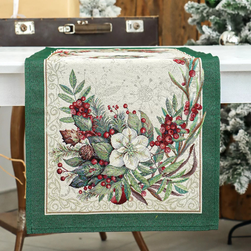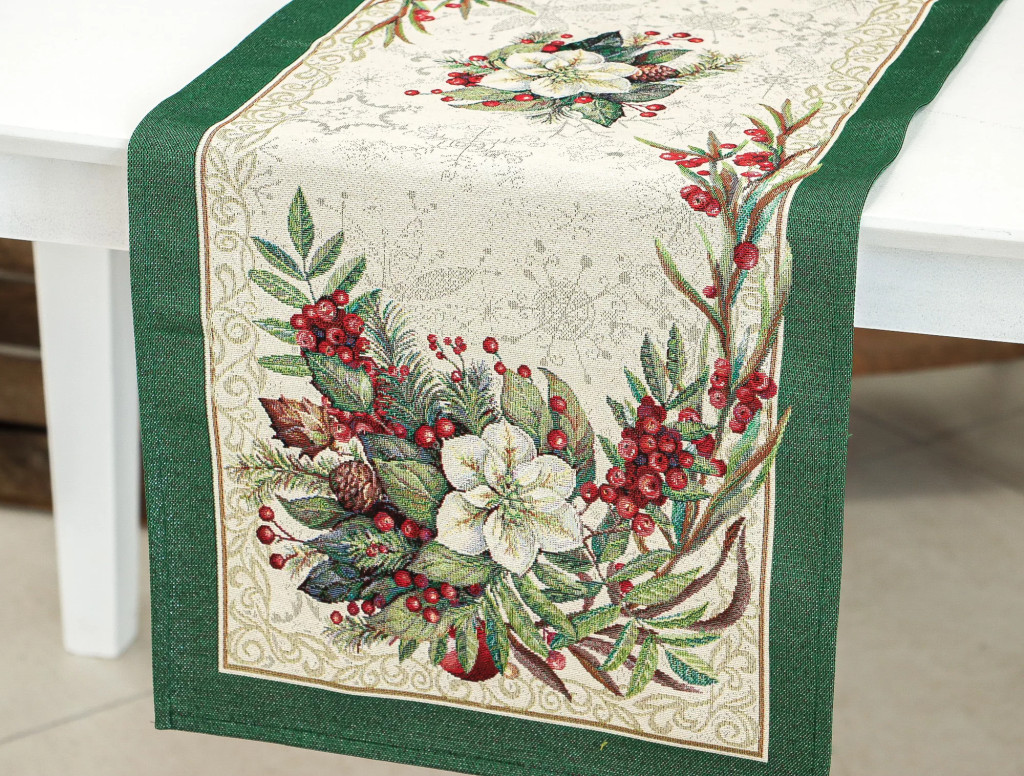 Varázsold ünnepivé az asztalterítést ezzel a különleges spanyol gobelin asztali futóval, amelyet fényesen csillogó ezüst lurex szálak tesznek igazán ünnepélyessé. A futó gyönyörű kompozícióban ábrázolja a téli ünnepek klasszikus motívumait: fehér virágokat, piros bogyókat, fenyőágakat és tobozokat, mindezt elegáns arany kerettel körülölelve. A háttér hópehelymintái finoman kiegészítik az ünnepi dizájnt, míg az ezüst lurex szálak különleges csillogást kölcsönöznek a terítőnek. Használható étkezőasztalon, komódon, dohányzóasztalon vagy ünnepi dekorációként bármely helyiségben.