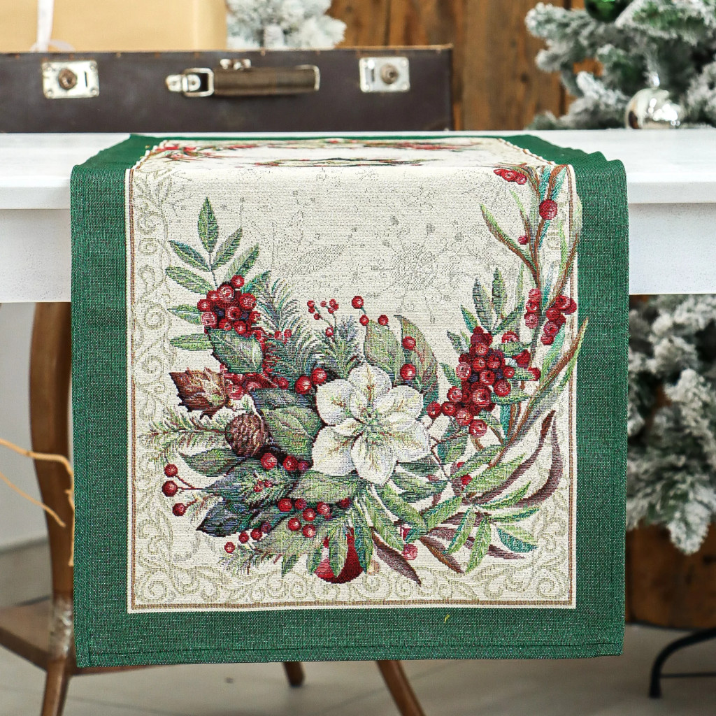 Varázsold ünnepivé az asztalterítést ezzel a különleges spanyol gobelin asztali futóval, amelyet fényesen csillogó ezüst lurex szálak tesznek igazán ünnepélyessé. A futó gyönyörű kompozícióban ábrázolja a téli ünnepek klasszikus motívumait: fehér virágokat, piros bogyókat, fenyőágakat és tobozokat, mindezt elegáns zöld kerettel körülölelve. A háttér hópehelymintái finoman kiegészítik az ünnepi dizájnt, míg az ezüst lurex szálak különleges csillogást kölcsönöznek a terítőnek. Használható étkezőasztalon, komódon, dohányzóasztalon vagy ünnepi dekorációként bármely helyiségben.