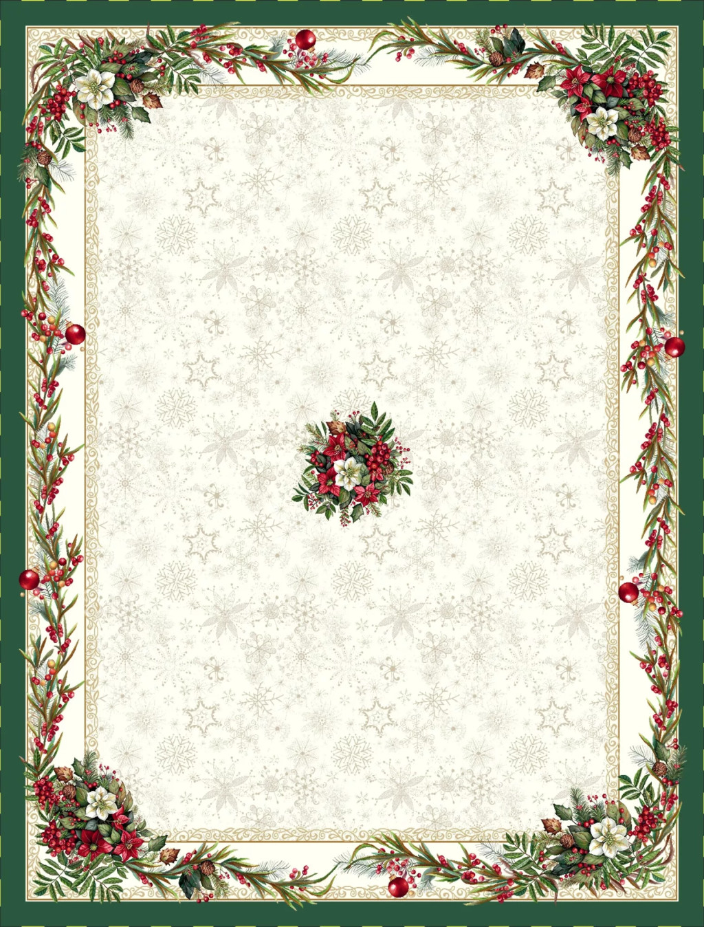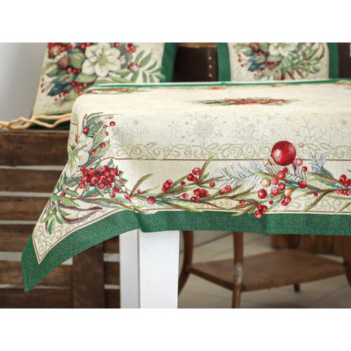 Varázsold ünnepivé az asztalterítést ezzel a különleges spanyol gobelin asztalterítővel, amelyet fényesen csillogó ezüst lurex szálak tesznek igazán ünnepélyessé. A terítő gyönyörű kompozícióban ábrázolja a téli ünnepek klasszikus motívumait: fehér virágokat, piros bogyókat, fenyőágakat és tobozokat, mindezt elegáns zöld kerettel körülölelve. A háttér hópehelymintái finoman kiegészítik az ünnepi dizájnt, míg az ezüst lurex szálak különleges csillogást kölcsönöznek a terítőnek.