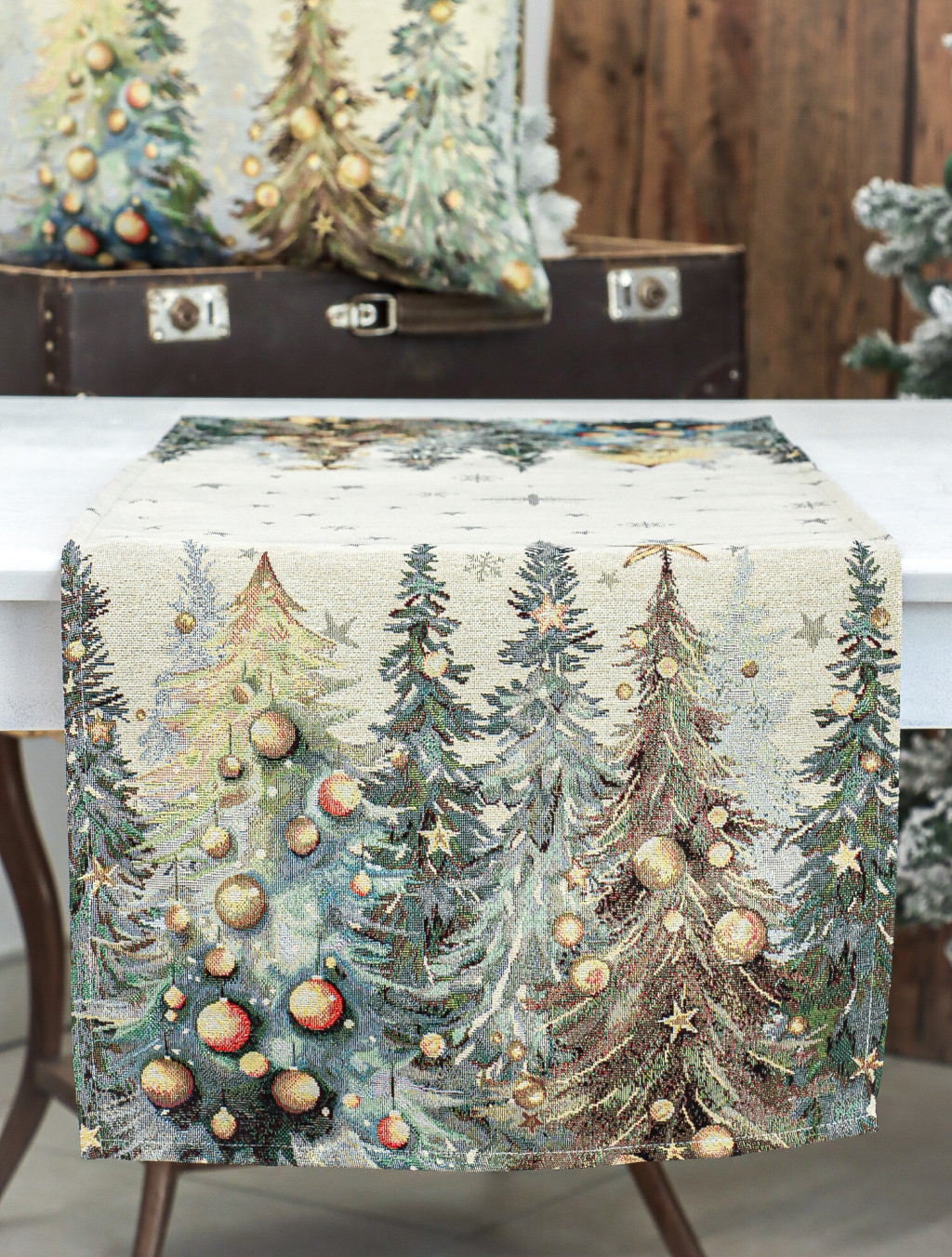 Ünnepi asztali futó aranyló csillagokkal és gömbökkel dekorált fenyőerdővel. Anyaga gépi szövésű gobelin, amelyet arany lurexes szövés tesz még különlegesebbé.