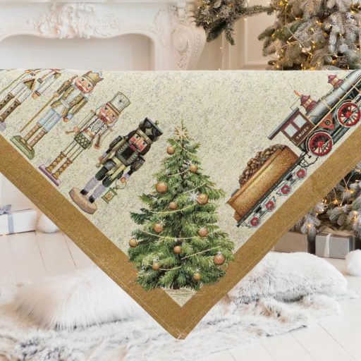 Diótörőkkel, karácsonyfákkal, kisvonatokkal és díszekkel dekorált karácsonyi asztalterítő. Anyaga vastag gépi gobelin, arany lurexes csillogása teszi igazán ünnepi hangulatúvá. Prémium minőségű termék, amely pompásan mutat az ünnepi asztalon. Megfelelő kezelés mellett hosszú évekig megőrzi szépségét és minőségét.