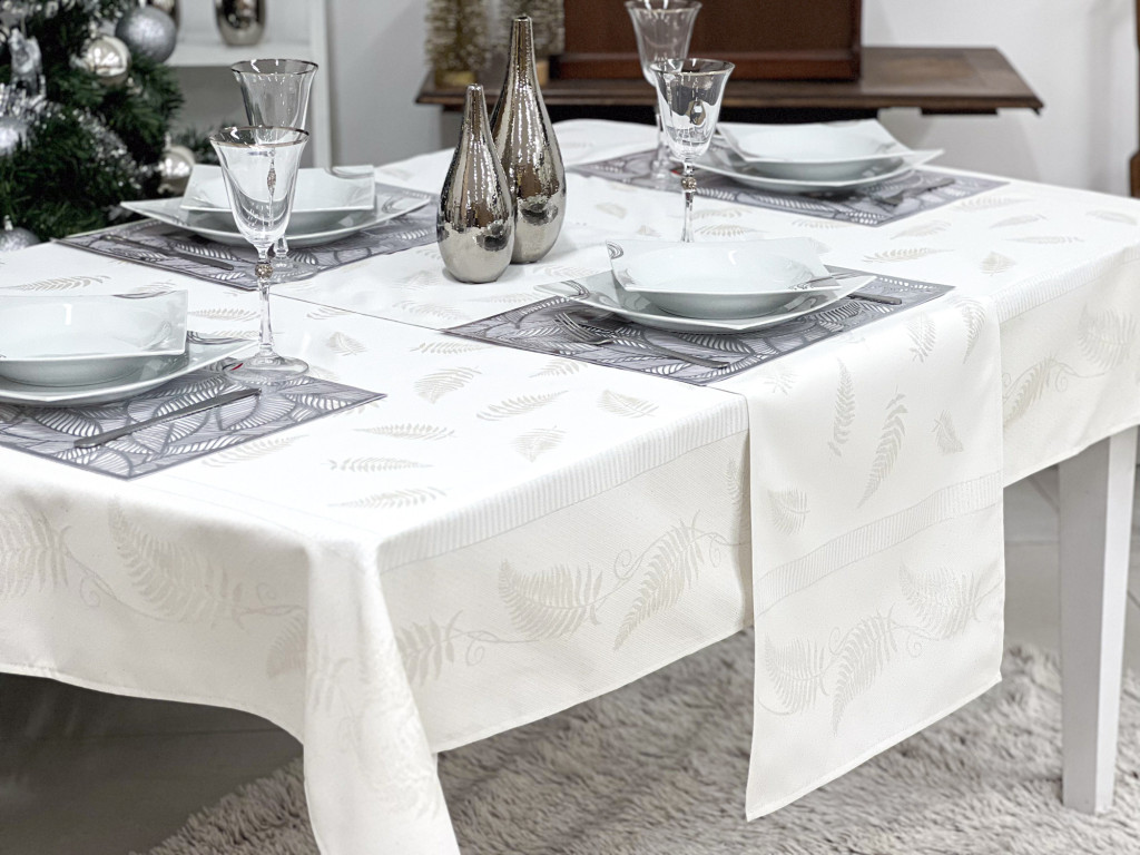 Dobd fel étkeződ vagy ünnepi asztalod megjelenését ezzel a lenyűgöző ezüst lurexes asztali futóval, amely elegáns mintázattal büszkélkedhet és csillogó hatást kelt. A mintázatot finoman kidolgozott ezüstszínű páfránylevelek díszítik, amelyek kifinomult és természetes megjelenést kölcsönöznek a terméknek. A futó mindkét végén dekoratív szegély található. Ideális választás egy elegáns ebédhez, különleges alkalmakra, esküvőre, karácsonyra egyaránt.
