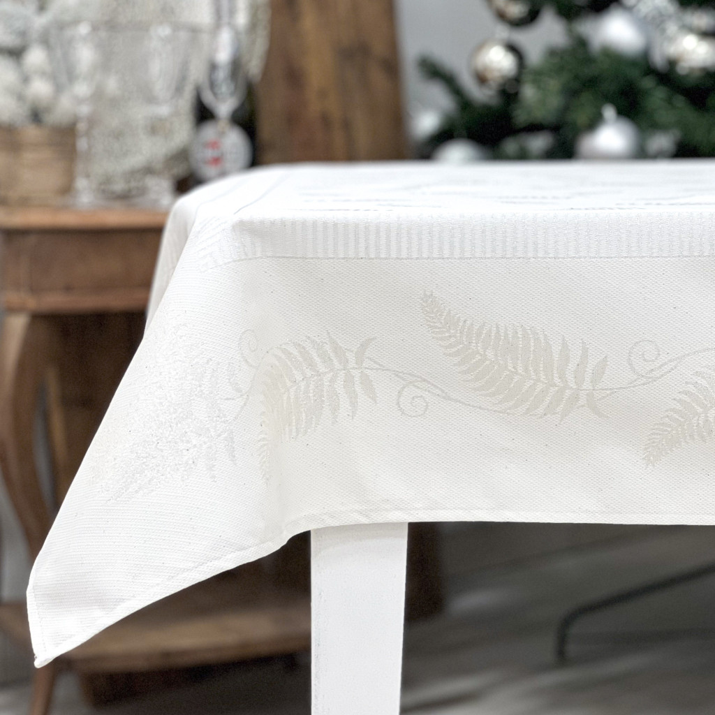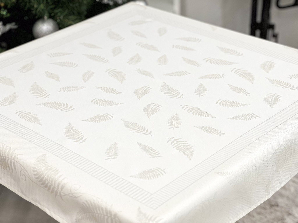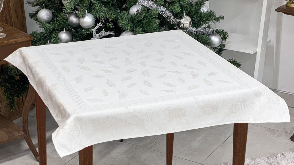 Ünnepi asztalterítő ezüst színű páfrányokkal dekorálva, amely eleganciát kölcsönöz az asztalnak. A 96 x 100 cm méretű terítő tökéletesen illeszkedik bármilyen asztalra, legyen az kerek, ovális vagy téglalap alakú.