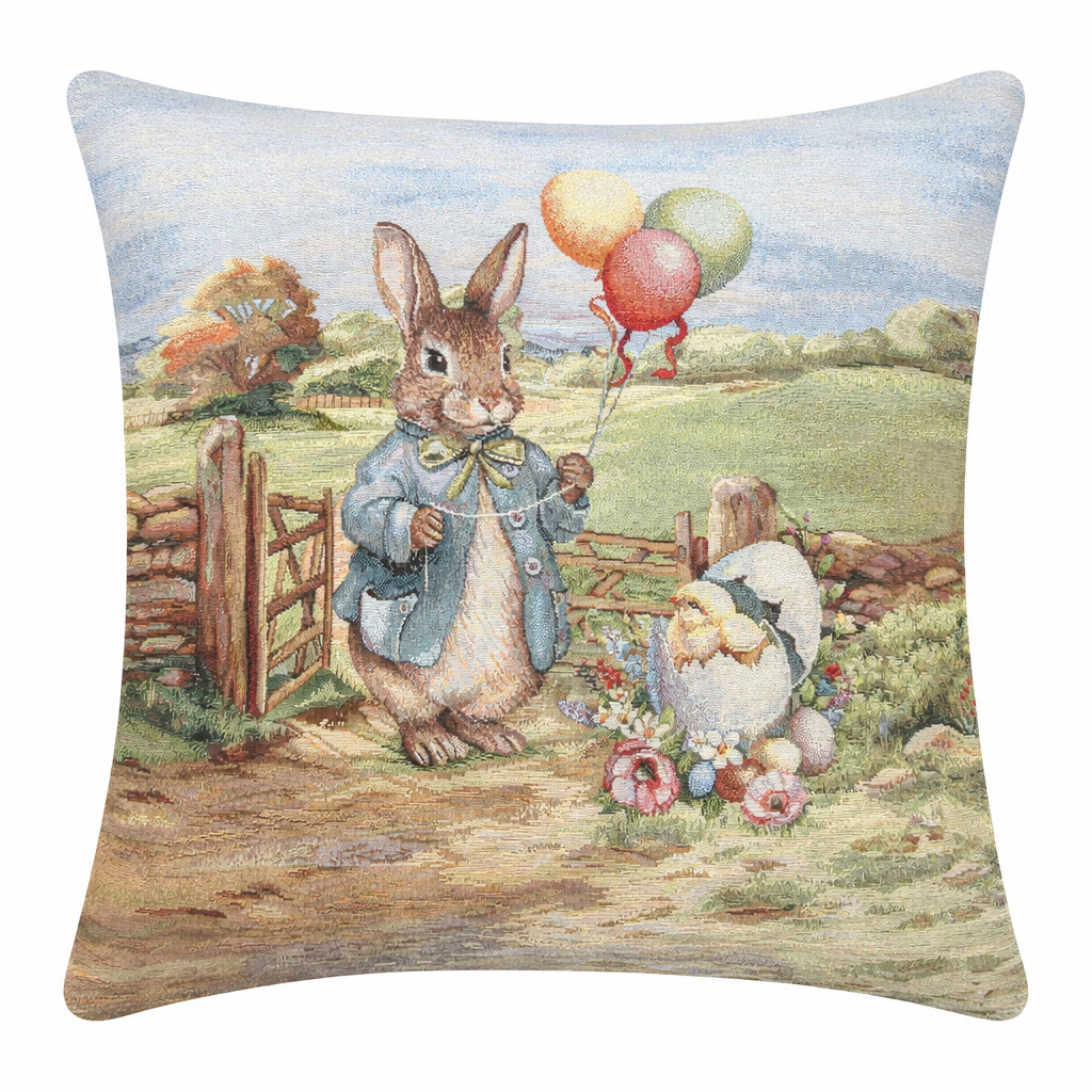 Ez a különleges spanyol gobelin párnahuzat a klasszikus gobelin megjelenést ötvözi a modern, precíz gépi szövési technológiával. A részletgazdag minta egy kedves húsvéti jelenetet ábrázol: lufikat tartó nyuszit, kiscsibét, virágokat és egy vidéki tájat, amely meleg, nosztalgikus és ünnepi hangulatot kölcsönöz az enteriőrnek.