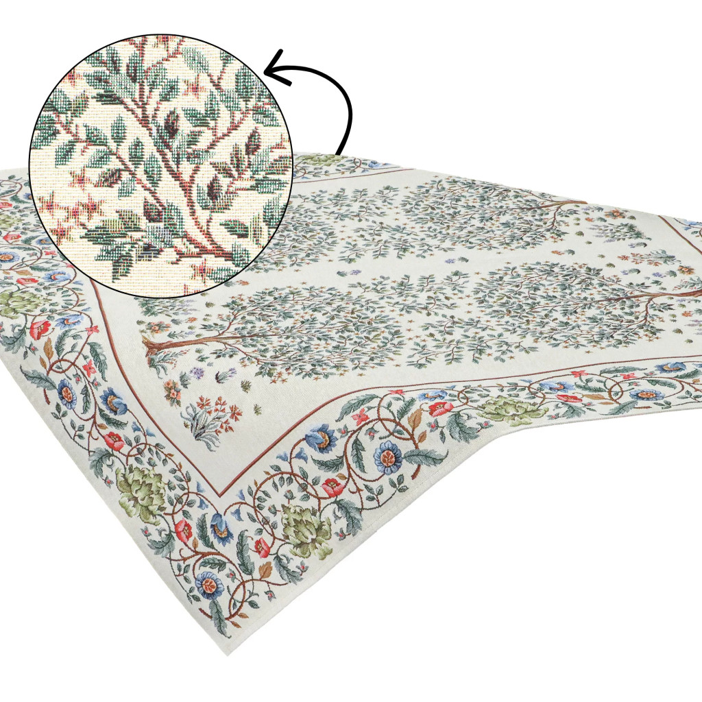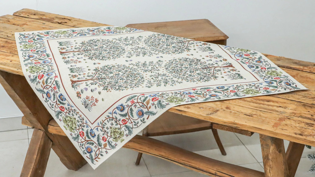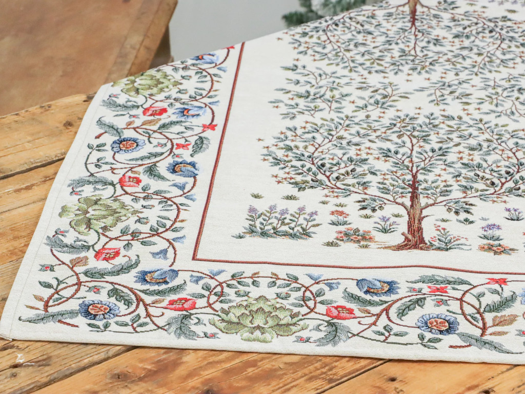 Vidd be otthonodba a klasszikus elegancia és a természet harmóniáját ezzel a gyönyörű, William Morris ihlette asztalterítővel! A részletgazdag, szimmetrikus mintázat – két fa motívummal és finoman kidolgozott virágos szegéllyel – művészi, mégis időtálló megjelenést ad bármilyen étkezőasztalnak vagy kerti asztalnak.