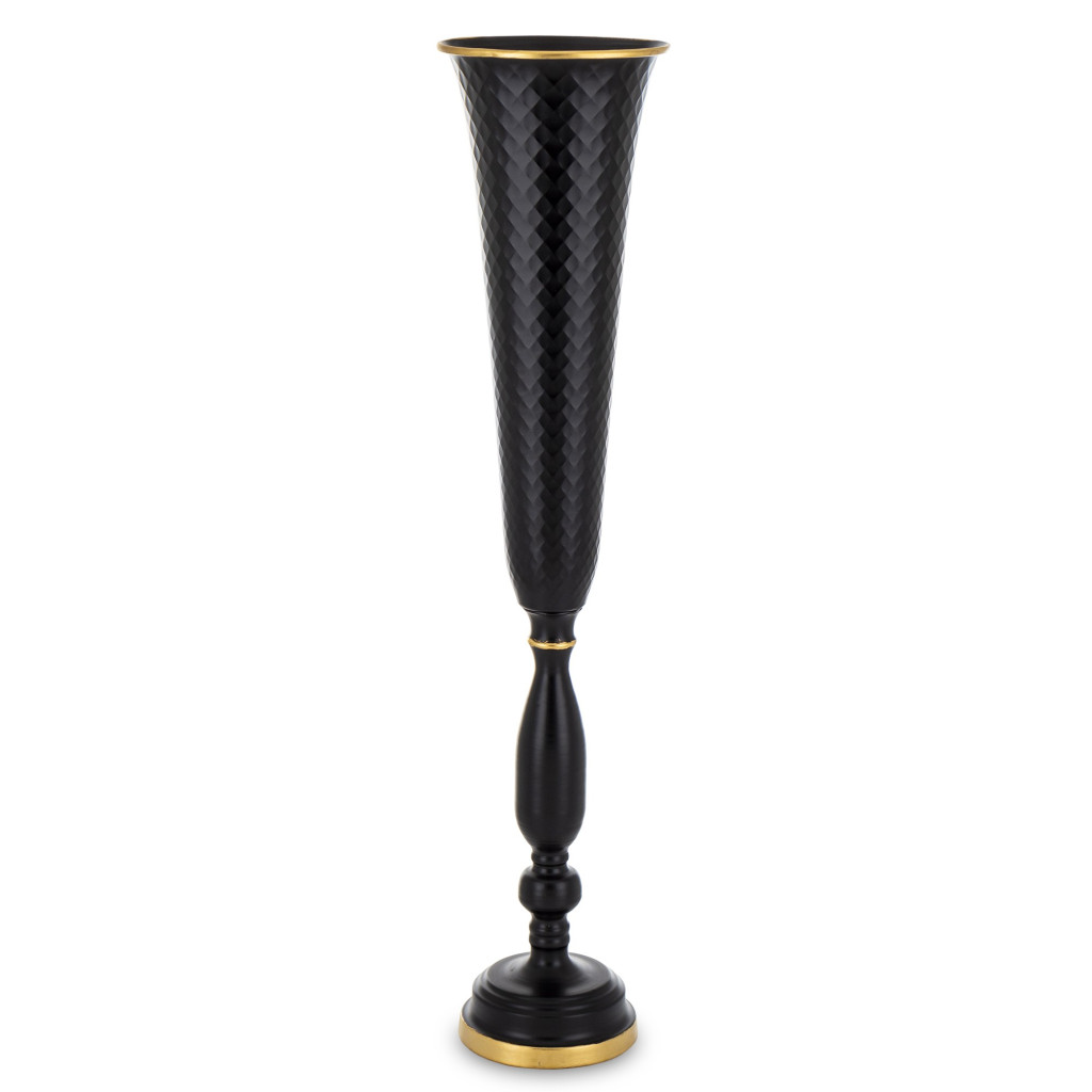 Ez a különleges megjelenésű fekete–arany fém váza tökéletes választás, ha karakteres és elegáns hangsúlyt szeretnél adni otthonodnak. A 70 cm magas, karcsú kialakítás és a finom, geometrikus textúra luxus hatást kelt, míg az arany szegélyek kifinomult kontrasztot teremtenek. Padlón elhelyezve önmagában is látványos dekoráció, de magas ágakkal vagy művirágokkal kombinálva igazán exkluzív összképet ad.