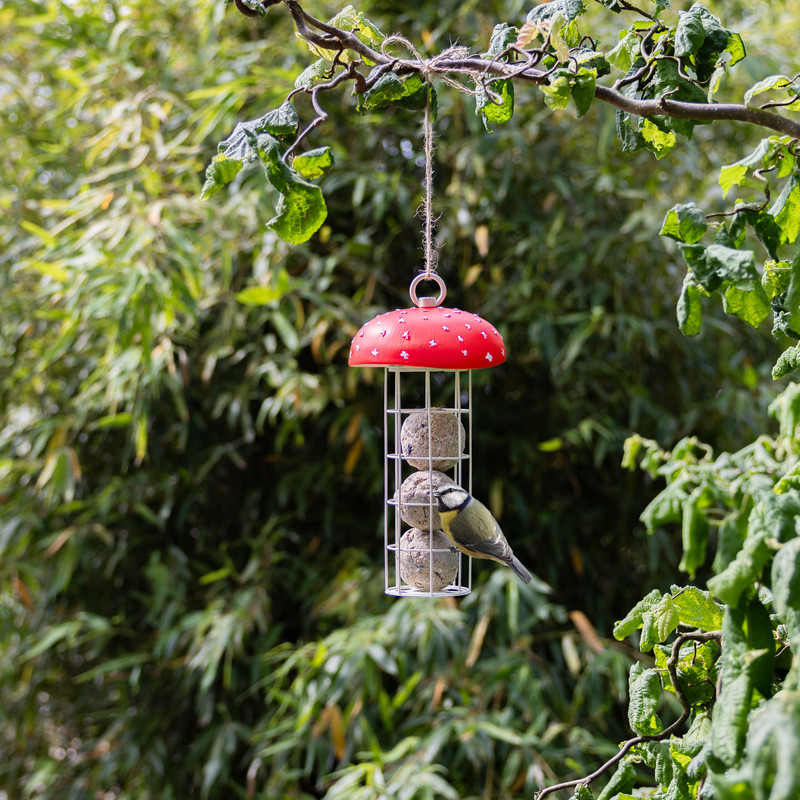 Felakasztható, önadagolós, faggyúgolyó tartó madáretető, légyölő galóca, 24,5 cm