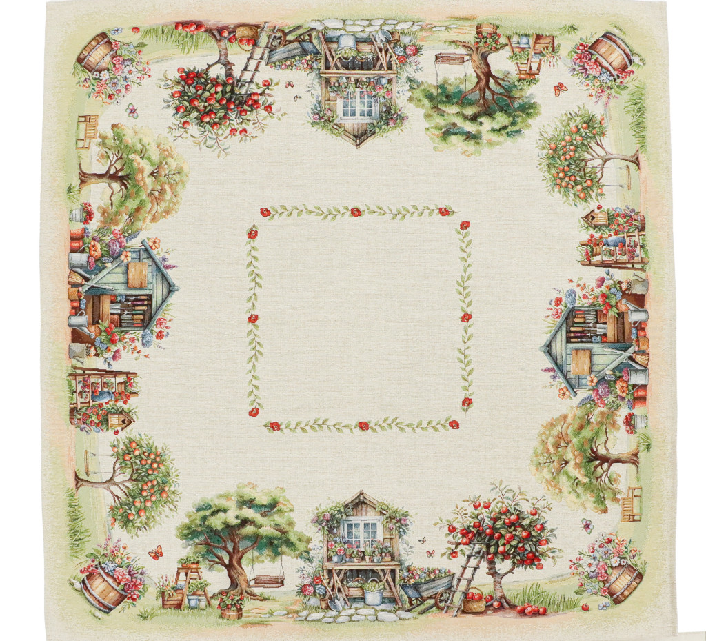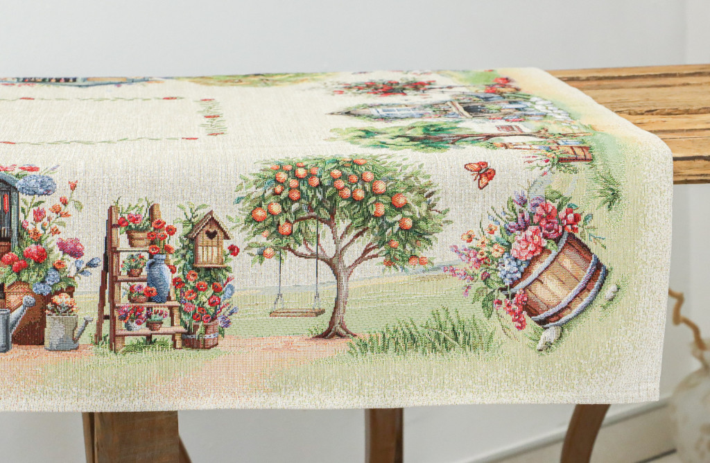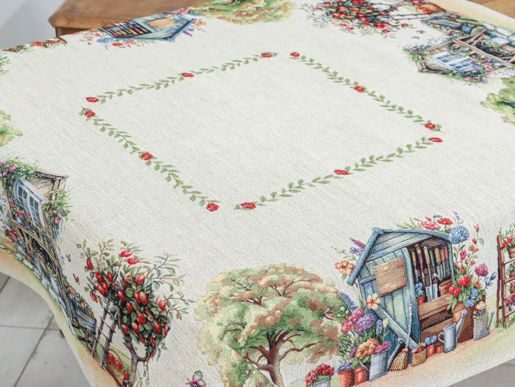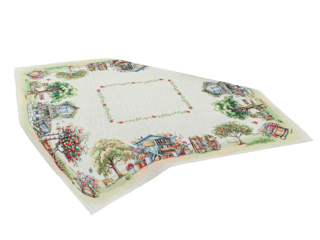 Gépi szövésű spanyol gobelin asztalterítő – kerti házikós motívummal