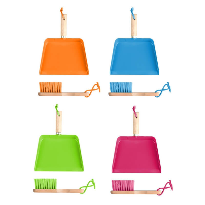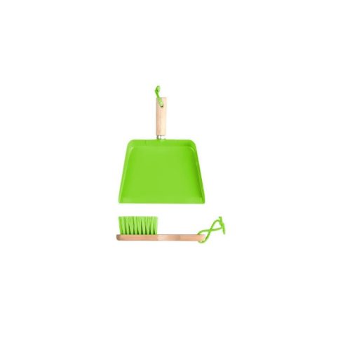Kézi seprű és lapát szett vidám zöld színben. Az eszközök kiváló minősége garantálja a sérülésmentes és biztonságos használatot gyermekednek, a játékos ház körüli teendők ellátása közben.