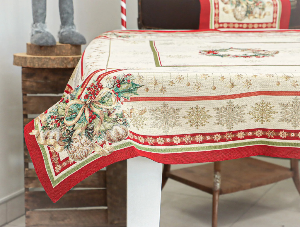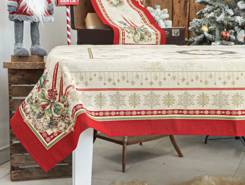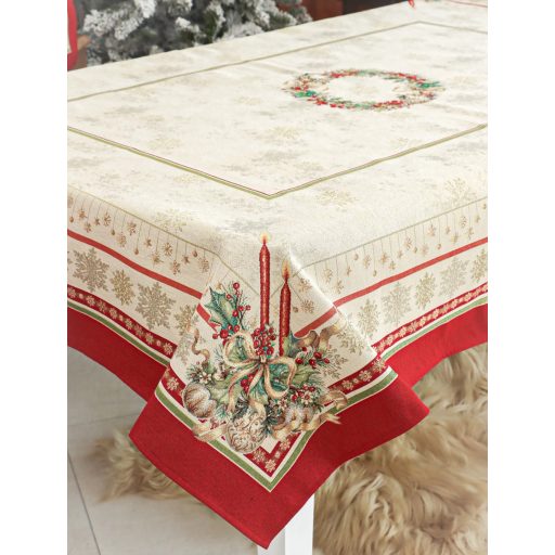 Varázsold ünnepivé az asztalterítést ezzel a gyertyás asztalterítővel, amelyet fényesen csillogó arany lurex szálak tesznek igazán ünnepélyessé. A terítő gazdagon díszített karácsonyi motívumokat ábrázol: piros gyertyákat aranyszalaggal, fenyőágakat, bogyókat, fenyőtobozokat és koszorút, amelyek klasszikus ünnepi hangulatot idéznek. A piros szegély arany hópehely mintával teszi teljessé a dizájnt. Mérete ideális 4-6 személyes étkezőasztalokhoz. A prémium minőségű, gépi szövésű spanyol gobelin tartós és elegáns, így mindennapi használatra és ünnepi alkalmakra is tökéletes.
