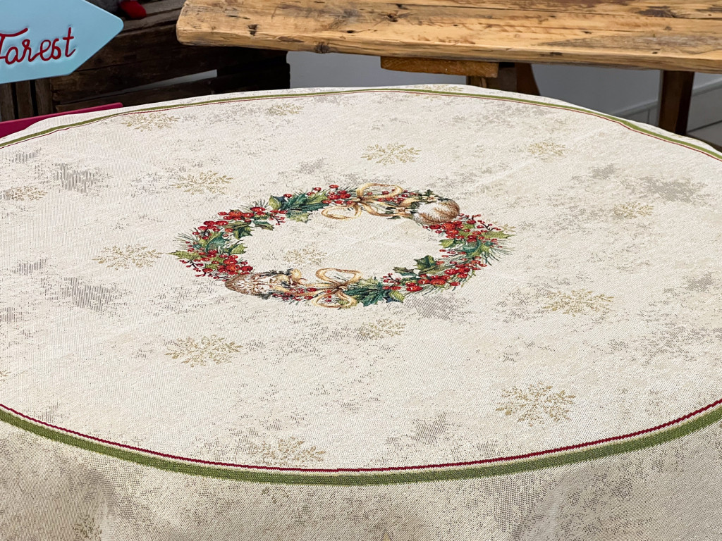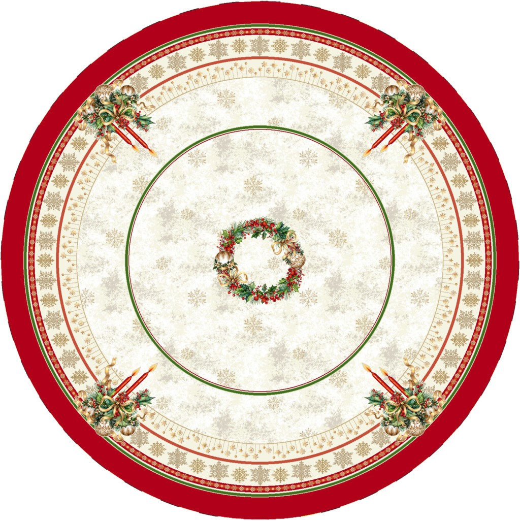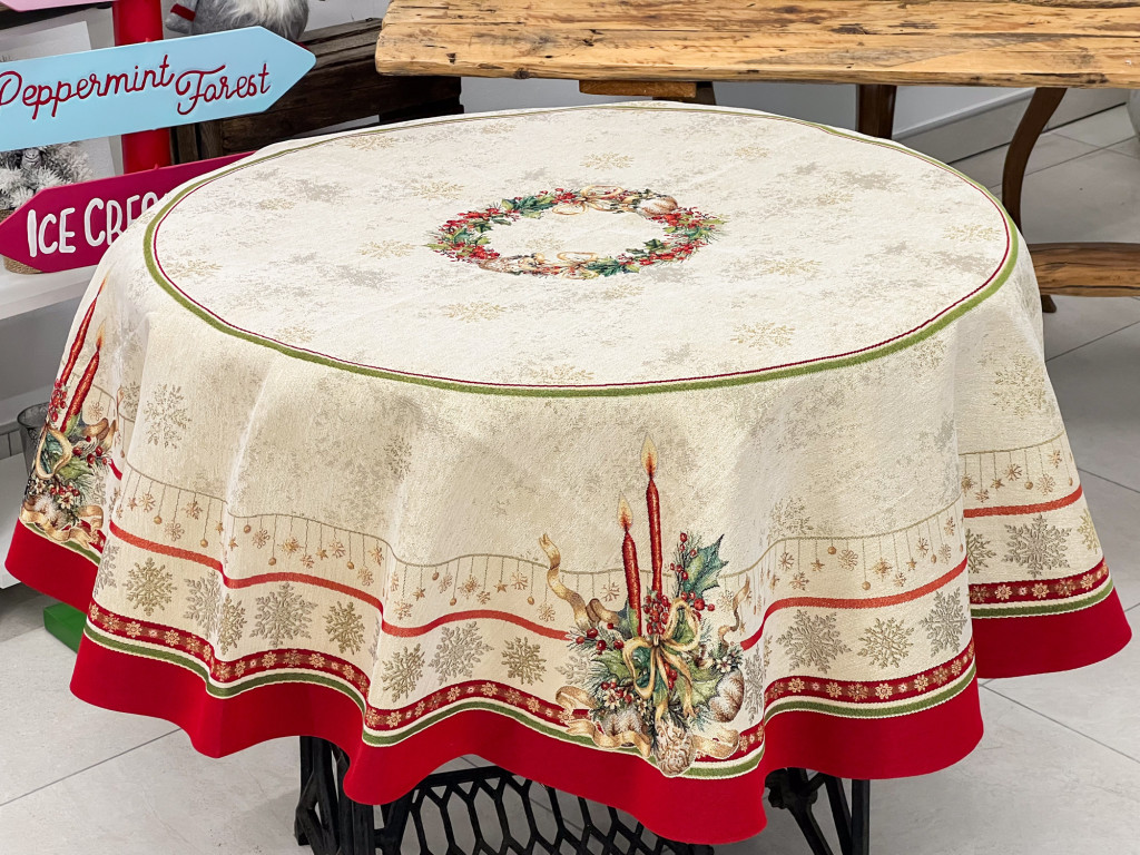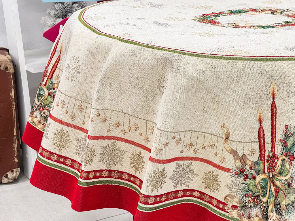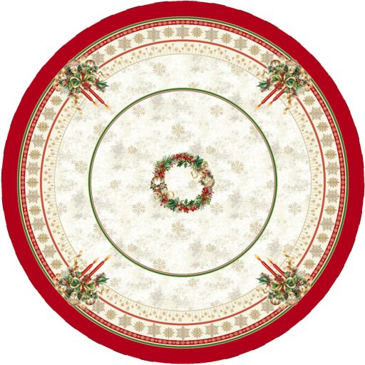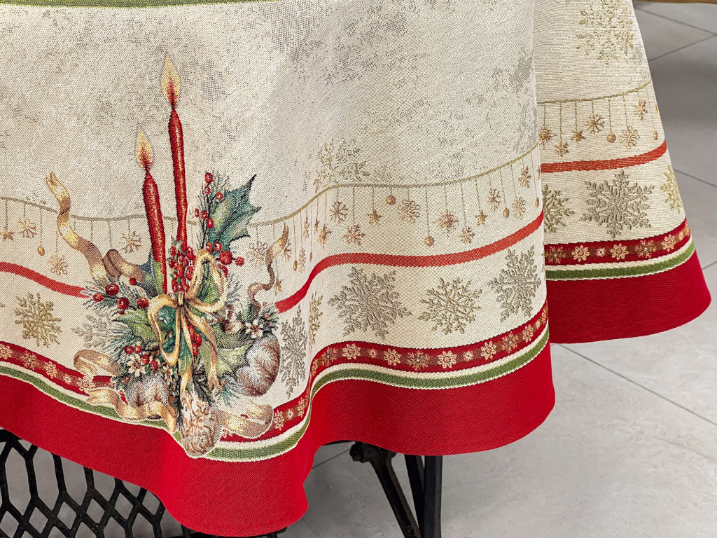 Gyertyás, piros szélű kollekció asztalterítője arany lurexes szövéssel, kör alakú asztalra. Ez a terítő gyönyörűen mutat az ünnepi asztalon, csillogása feldobja a karácsonyi étkezéseket. Megfelelő kezelés mellett hosszú éveking megőrzi szépségét és minőségét.