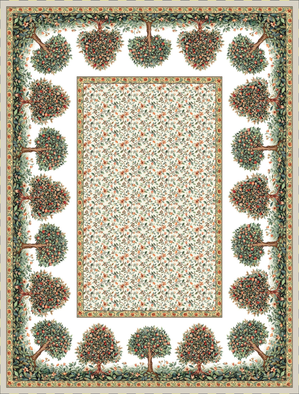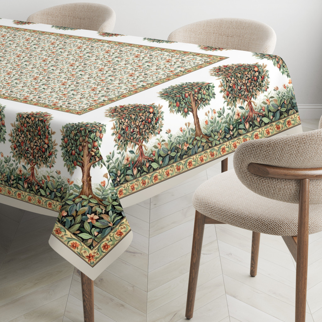 A részletgazdag minta központi motívuma az életfa, amely a természet, a harmónia és az élet körforgásának szimbóluma. A kompozíciót botanikus minták egészítik ki, amelyek elegáns, klasszikus hangulatot kölcsönöznek a textilnek. A zöld levelek és a meleg árnyalatú gyümölcsök természetközeli atmoszférát teremtenek, így a terítő stílusos fókuszponttá válik az asztalon.