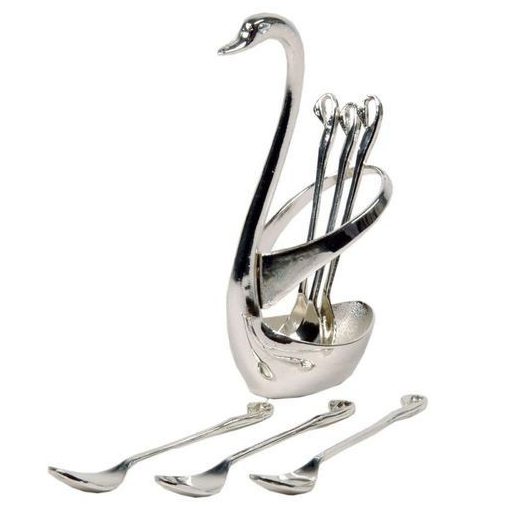 Fémből készült, ezüst színű, hattyú alakú tartó 6 db kiskanállal.