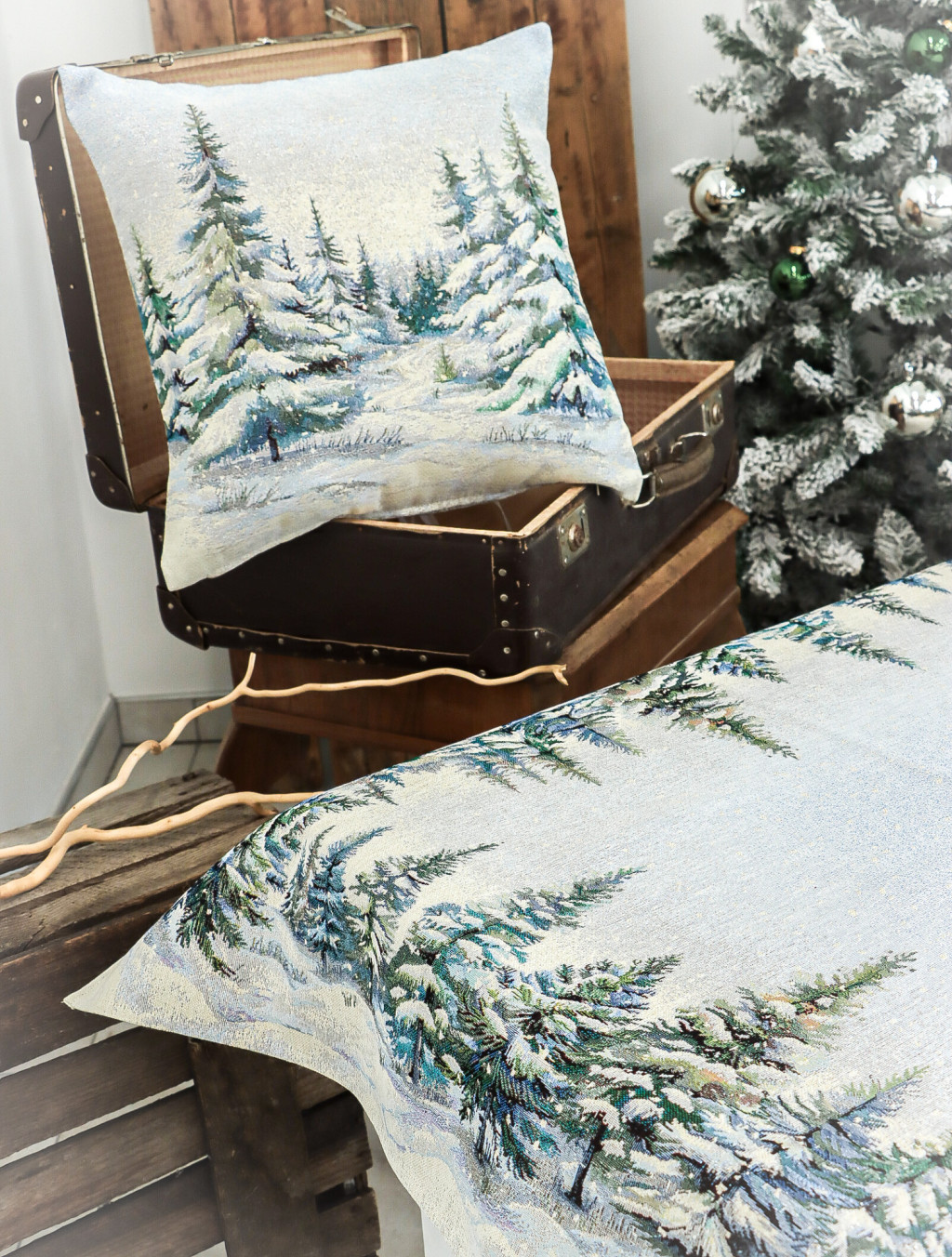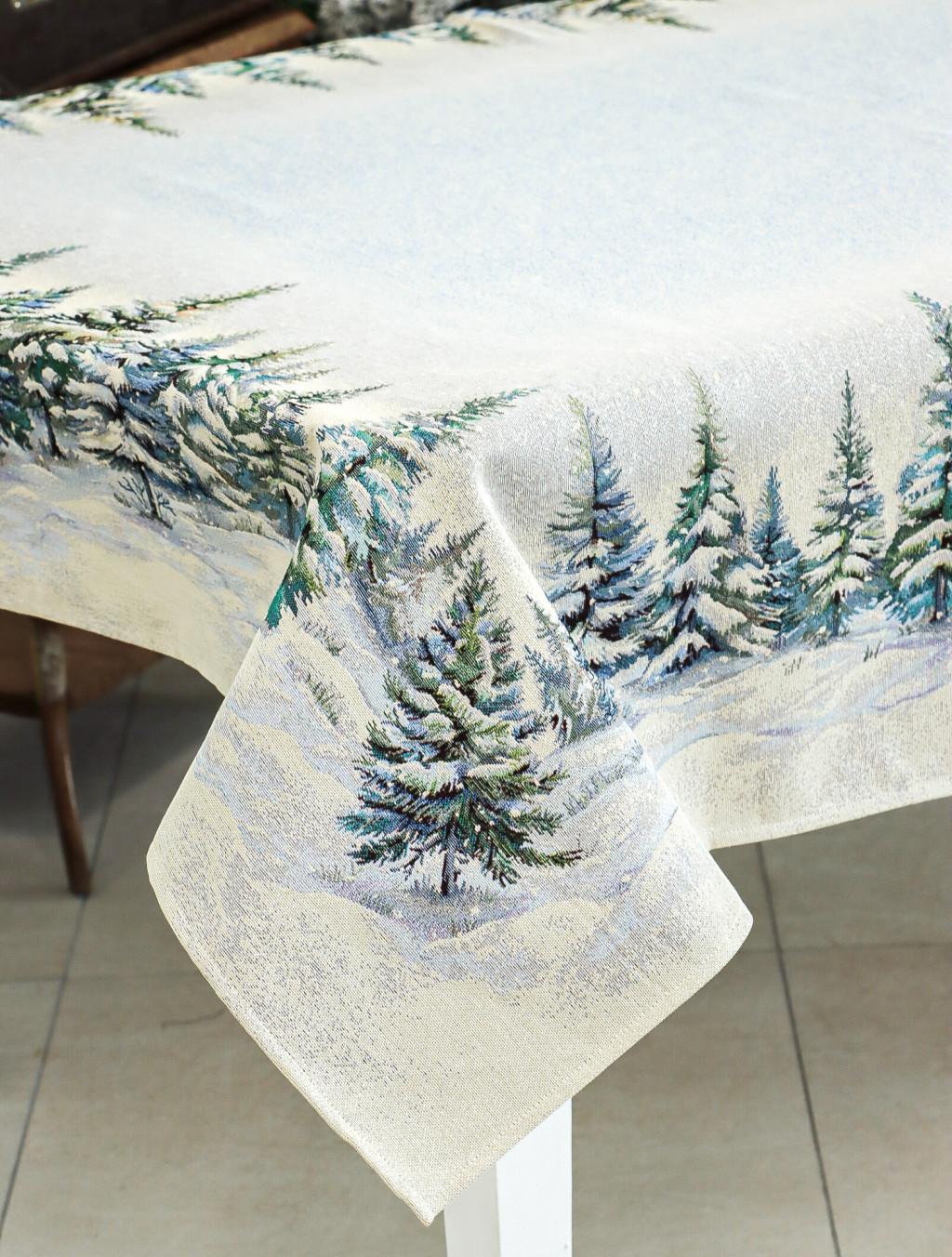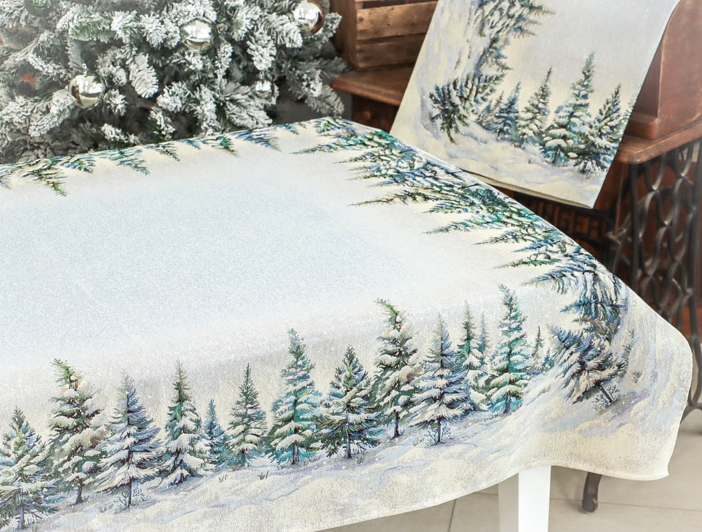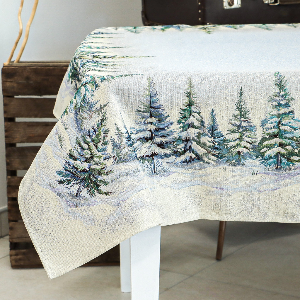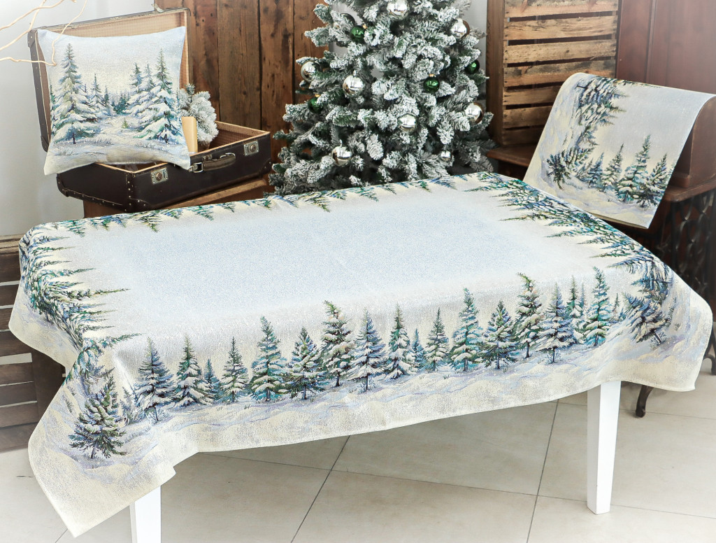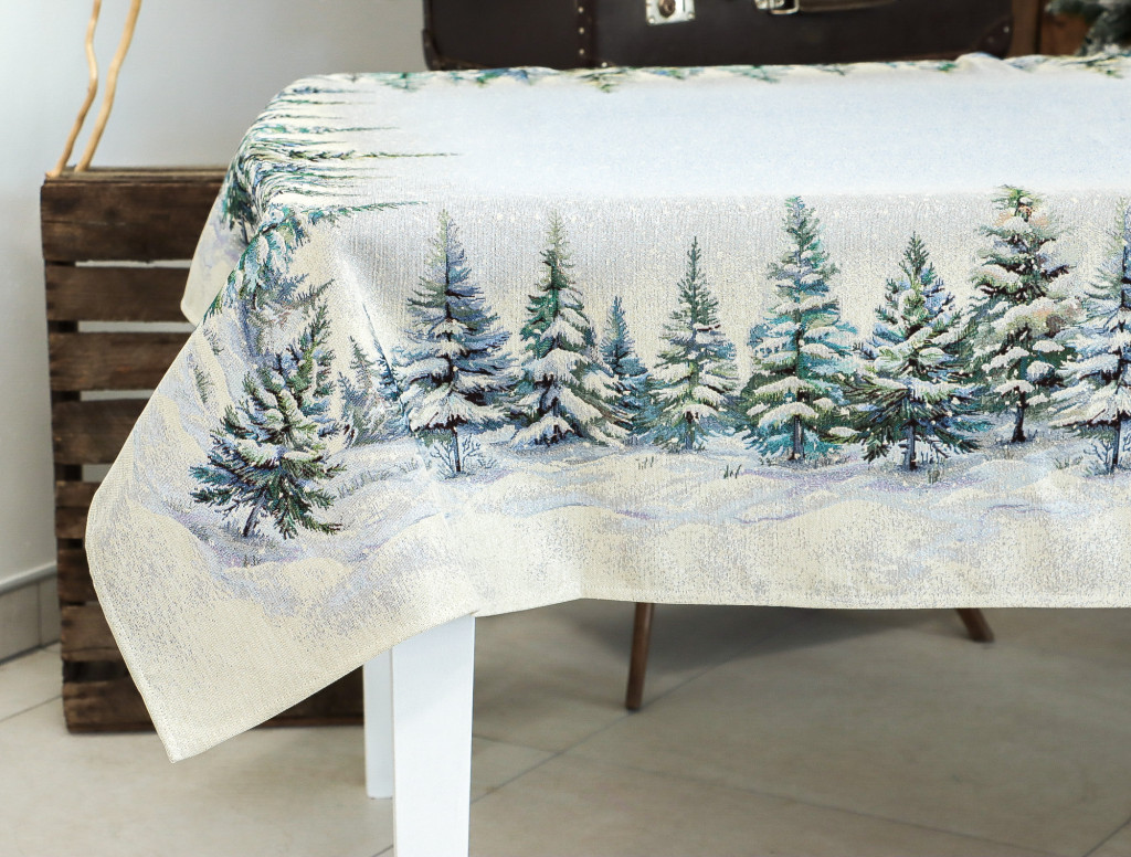 Ünnepi asztalterítő havas fenyőerdő mintával dekorálva. Anyaga prémium minőségű gépi gobelin, amelyet ezüst lurexes szövés tesz még különlegesebbé.
