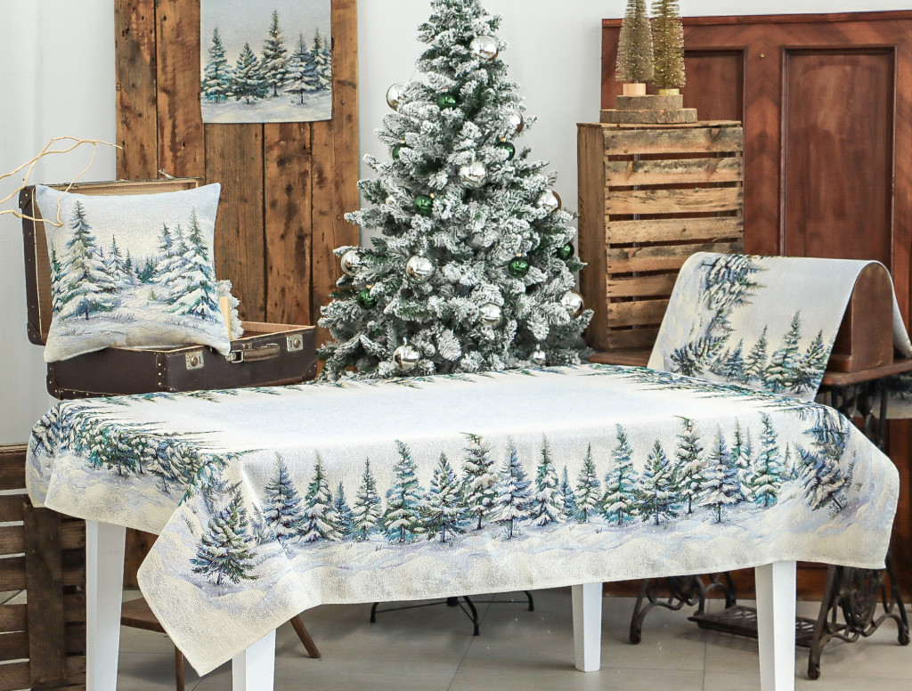 Ünnepi asztalterítő havas fenyőerdő mintával dekorálva. Anyaga prémium minőségű gépi gobelin, amelyet ezüst lurexes szövés tesz még különlegesebbé.