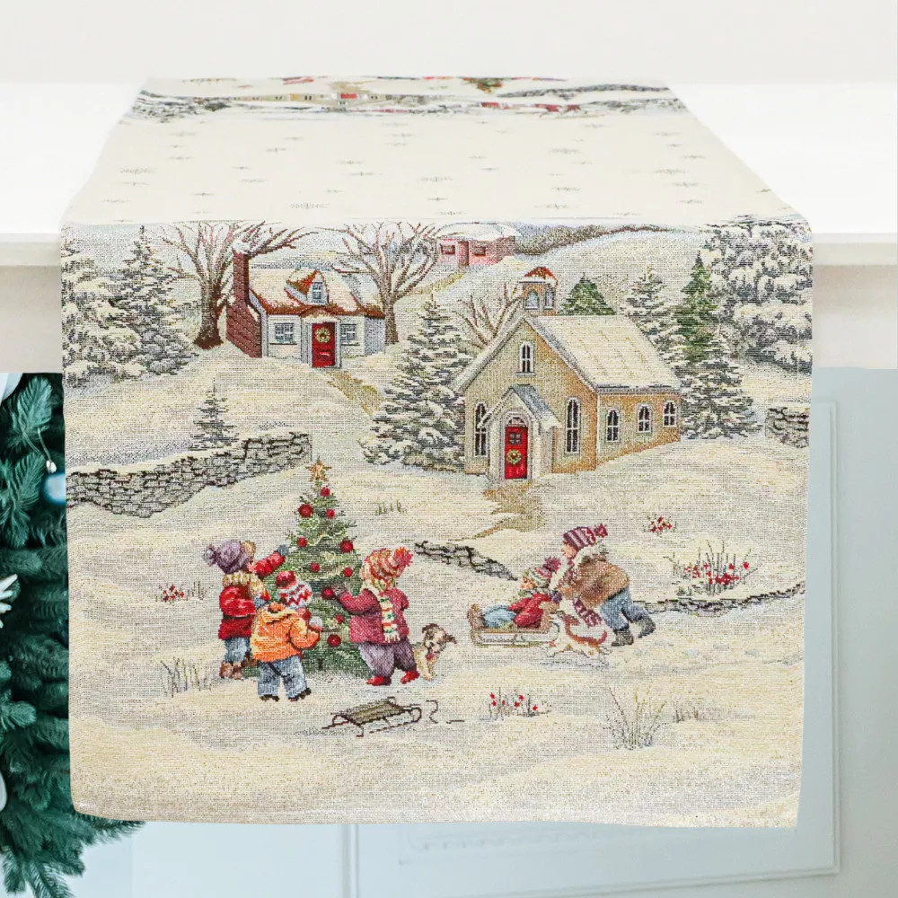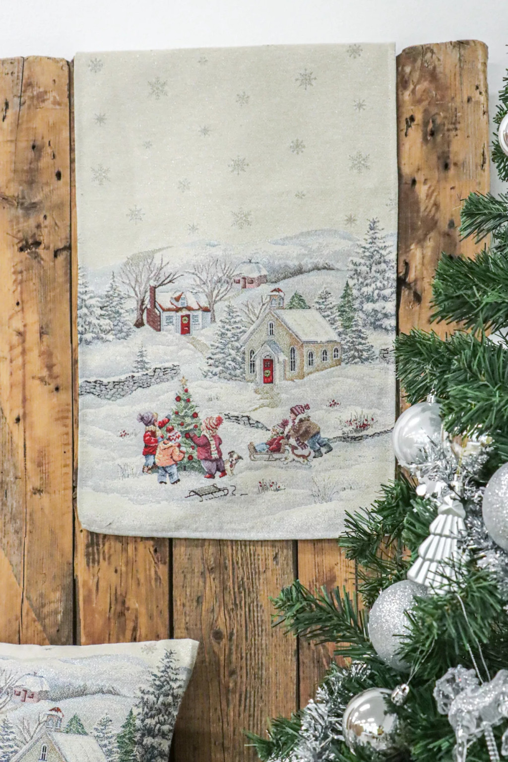 Az asztali futó közepén egyszerű, hópelyhekkel díszített, míg a két végén lévő vidám karácsonyi jelenetek téli vidéki tájat ábrázolnak. Itt kis házak, templomok és örömteli ünneplők, például fenyőfát cipelő és szánkózó gyermekek jelennek meg. A hóborította táj és az ünnepi motívumok harmóniája igazán meleg, meghitt hangulatot teremt az ünnepi összejövetelekhez.