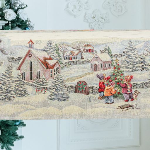Hóborította táj, kis házikók, örömteli ünneplők láthatók ezen az ünnepi asztalterítőn. Anyaga prémium minőségű gépi gobelin, arany színű csillogása teszi igazán különlegessé.