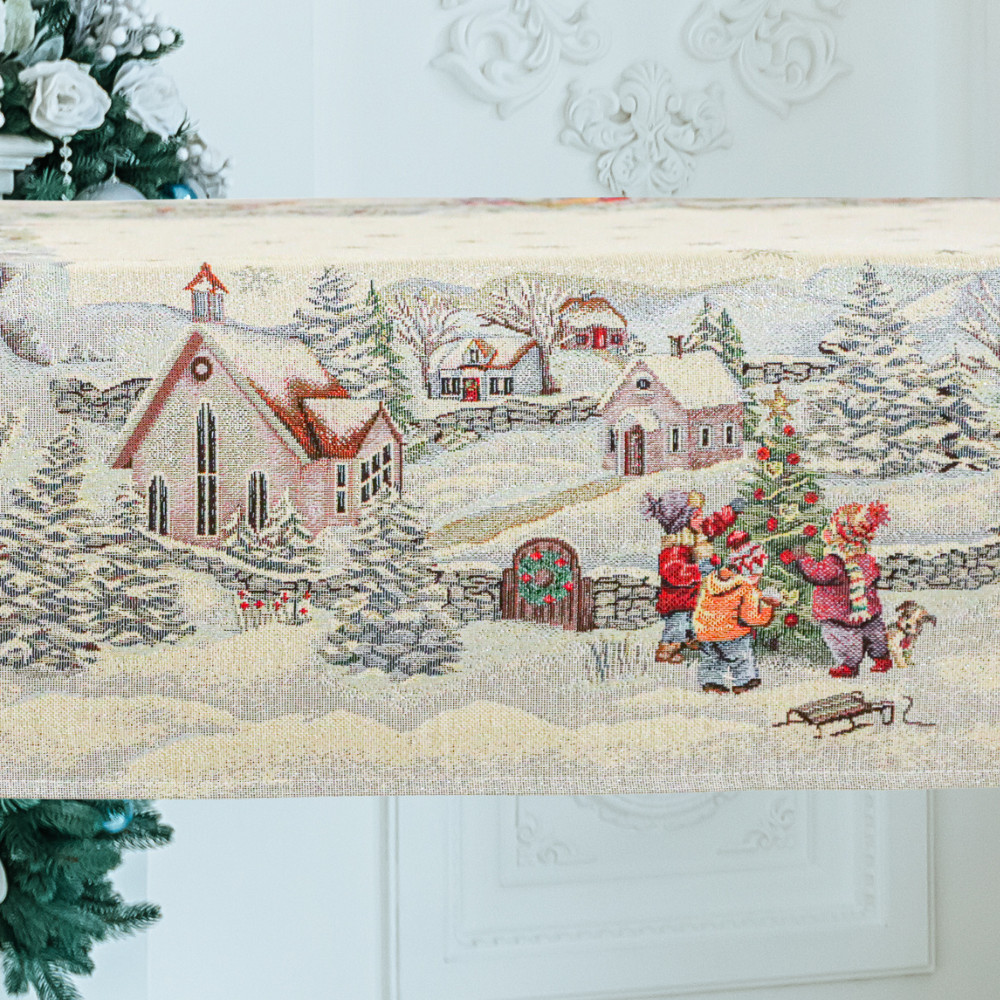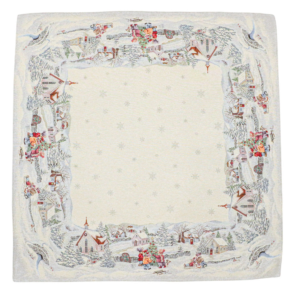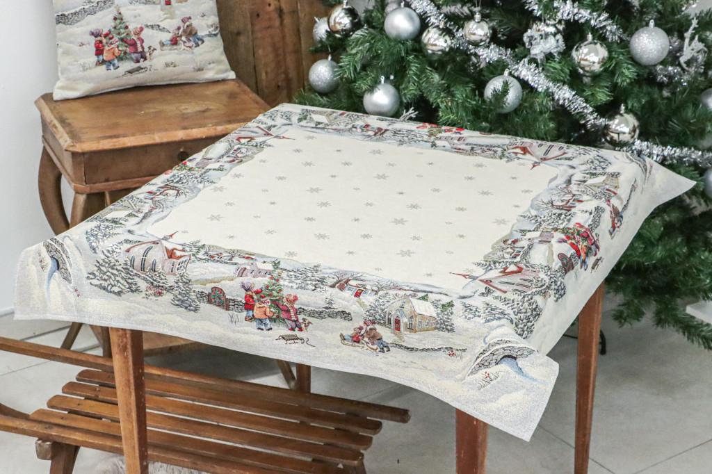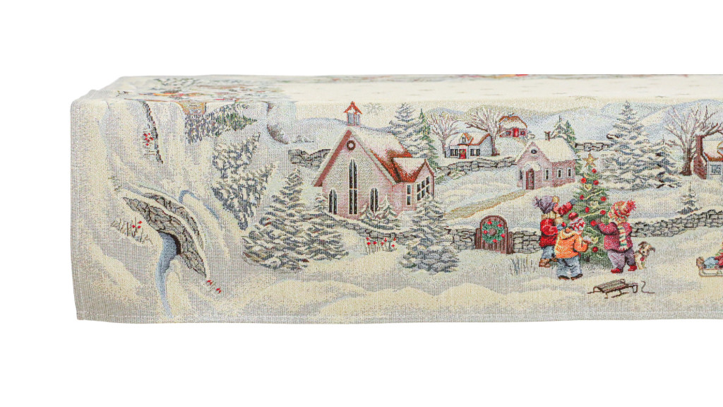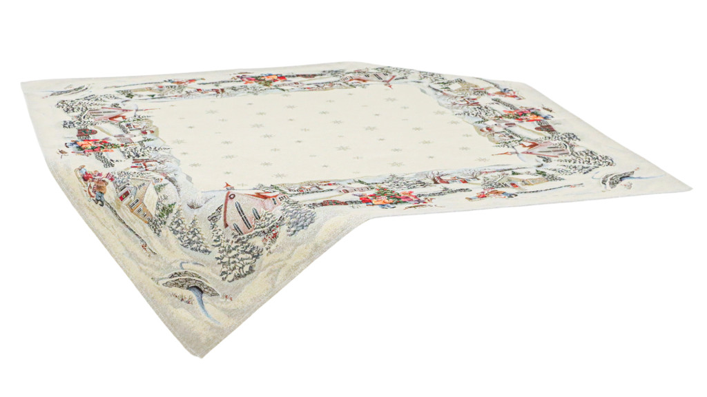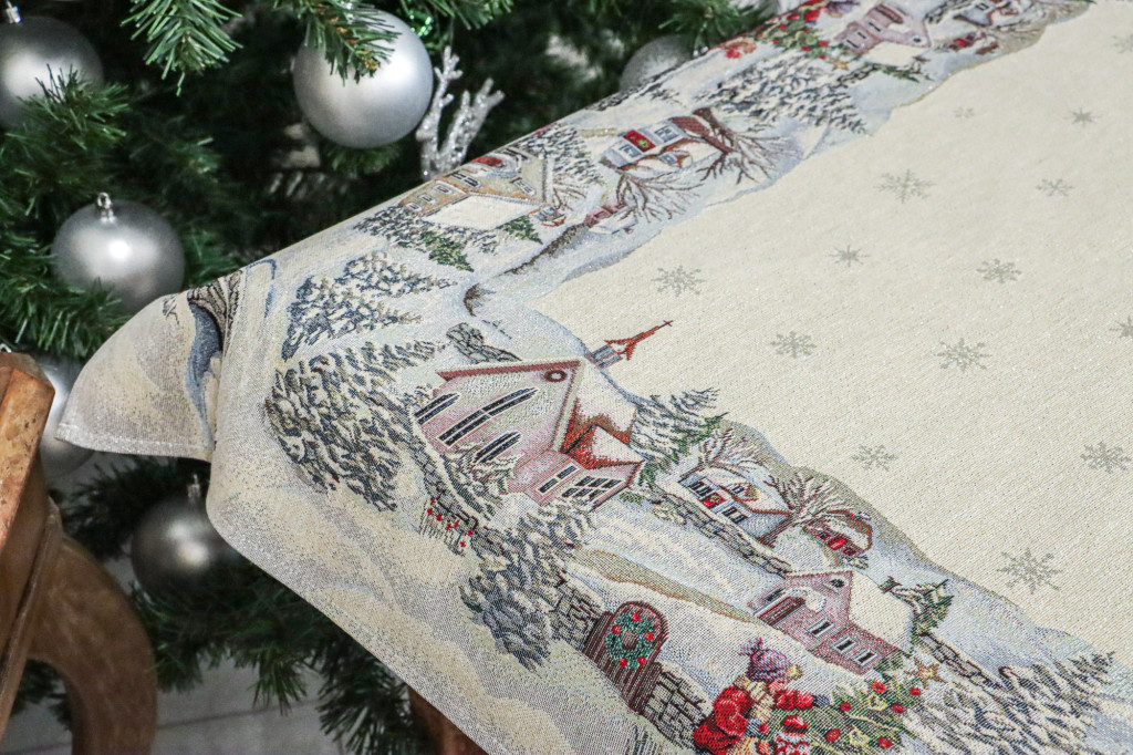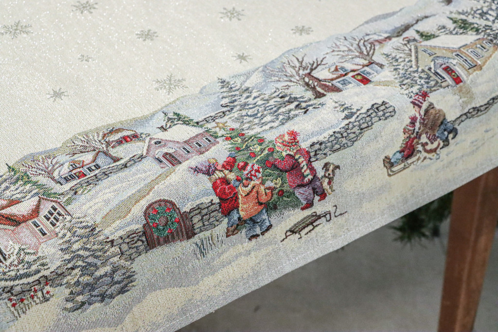 Az asztalterítő központi része egyszerű, hópelyhekkel díszített, míg szélén lévő vidám karácsonyi jelenetek téli vidéki tájat ábrázolnak. Itt kis házak, templomok és örömteli ünneplők, például fenyőfát cipelő családok és szánkózó gyermekek jelennek meg. A hóborította táj és az ünnepi motívumok harmóniája igazán meleg, meghitt hangulatot teremt az ünnepi összejövetelekhez.