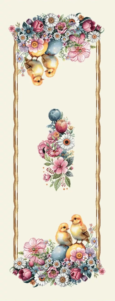 A részletgazdag minta kedves húsvéti jelenetet ábrázol: aranyos csibéket festett tojásokkal, gazdag virágkompozíciókkal és finom pasztell árnyalatokkal, amelyek meleg, tavaszias és ünnepi hangulatotteremtenek.