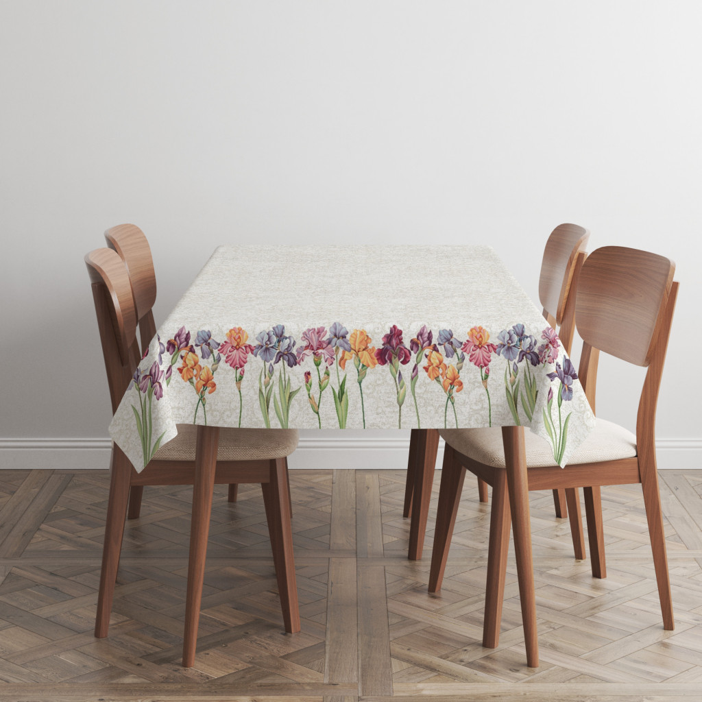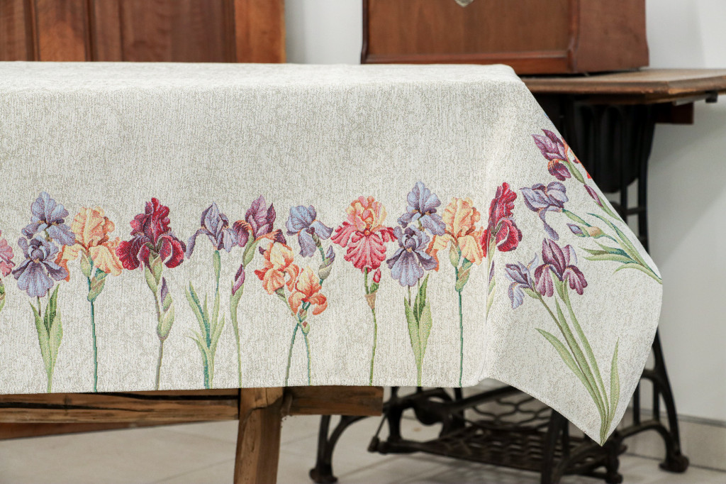 Ez a gyönyörű, gépi gobelin asztalterítő valódi éke lehet az étkeződnek. A részletgazdag, élénk színű íriszek és szegfűk keretként ölelik körbe a terítőt, míg a középső rész diszkréten mintázott háttérrel teremt harmonikus egyensúlyt.