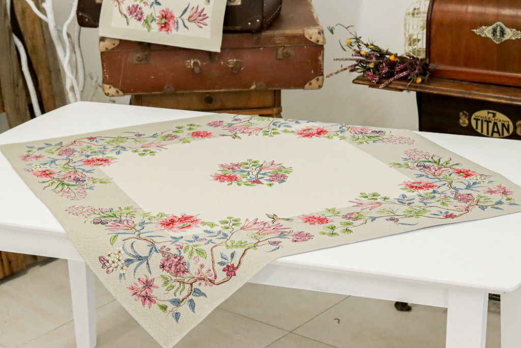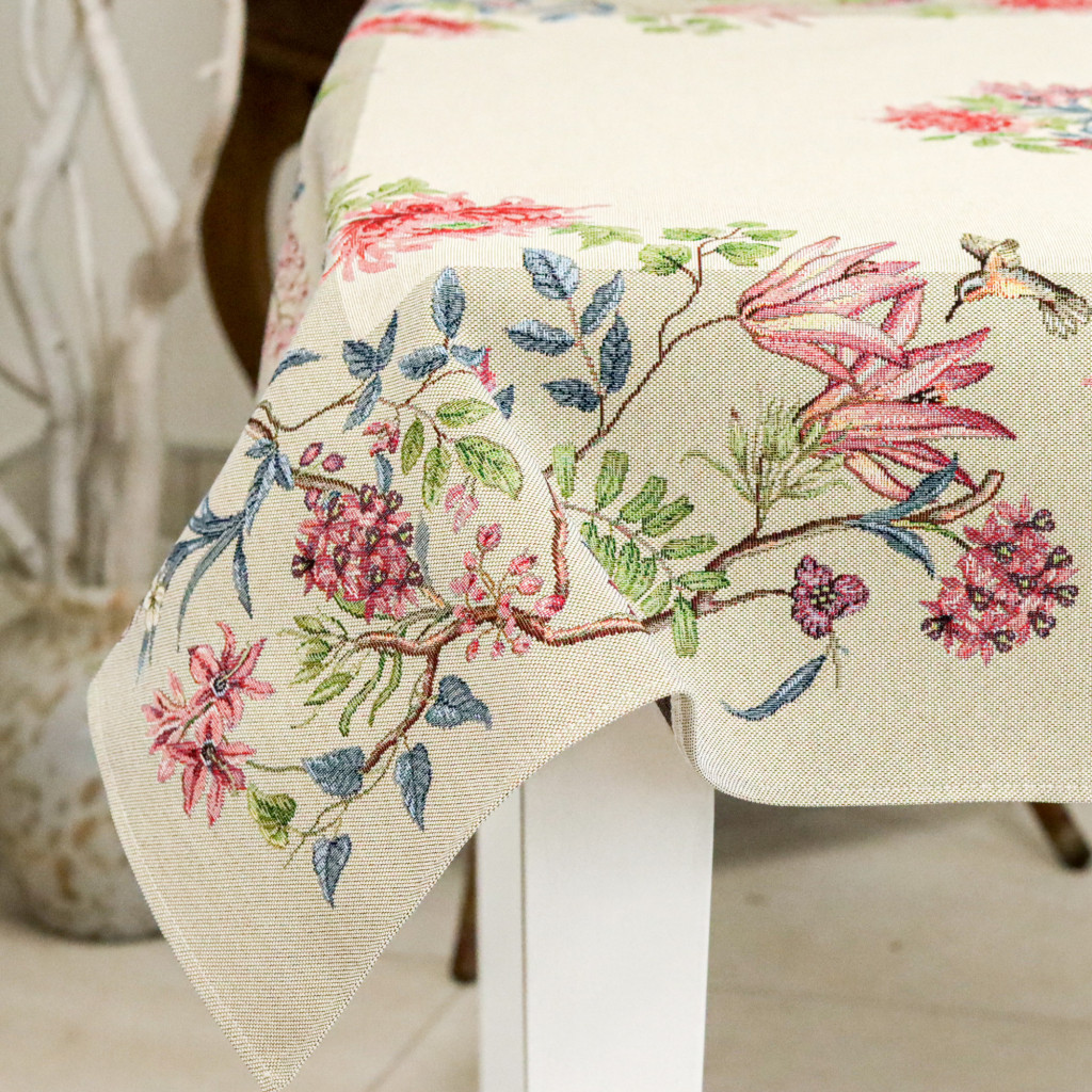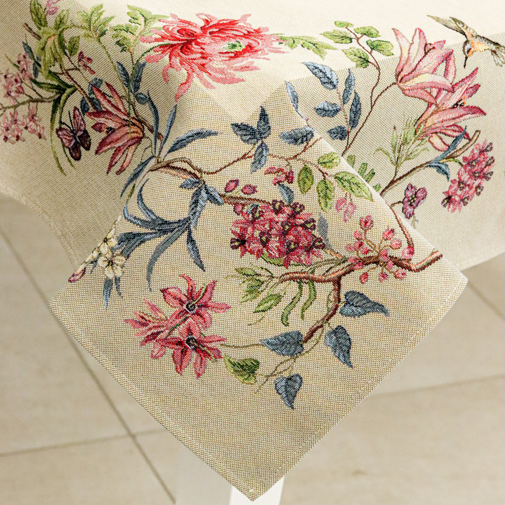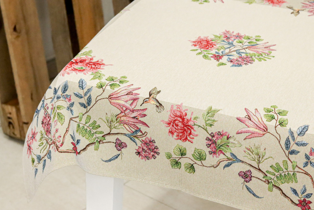 Japán virágokkal és kolibrivel dekorált gépi gobelin asztalterítő, amely a megfelelő kezelés mellett hosszú éveken át megőrzi színét és minőségét.