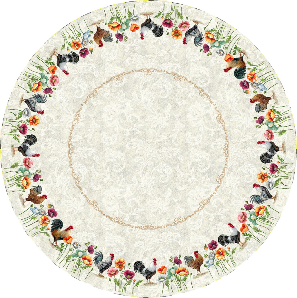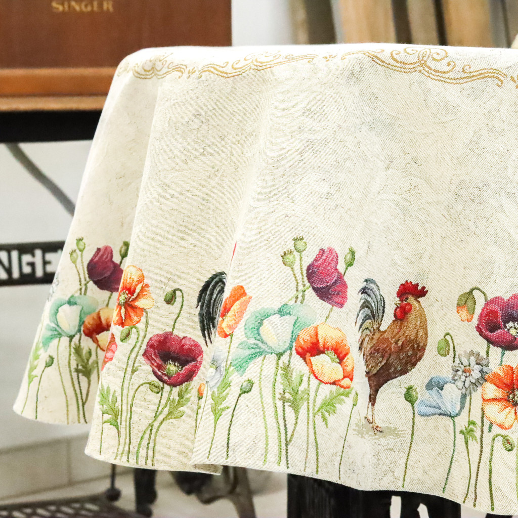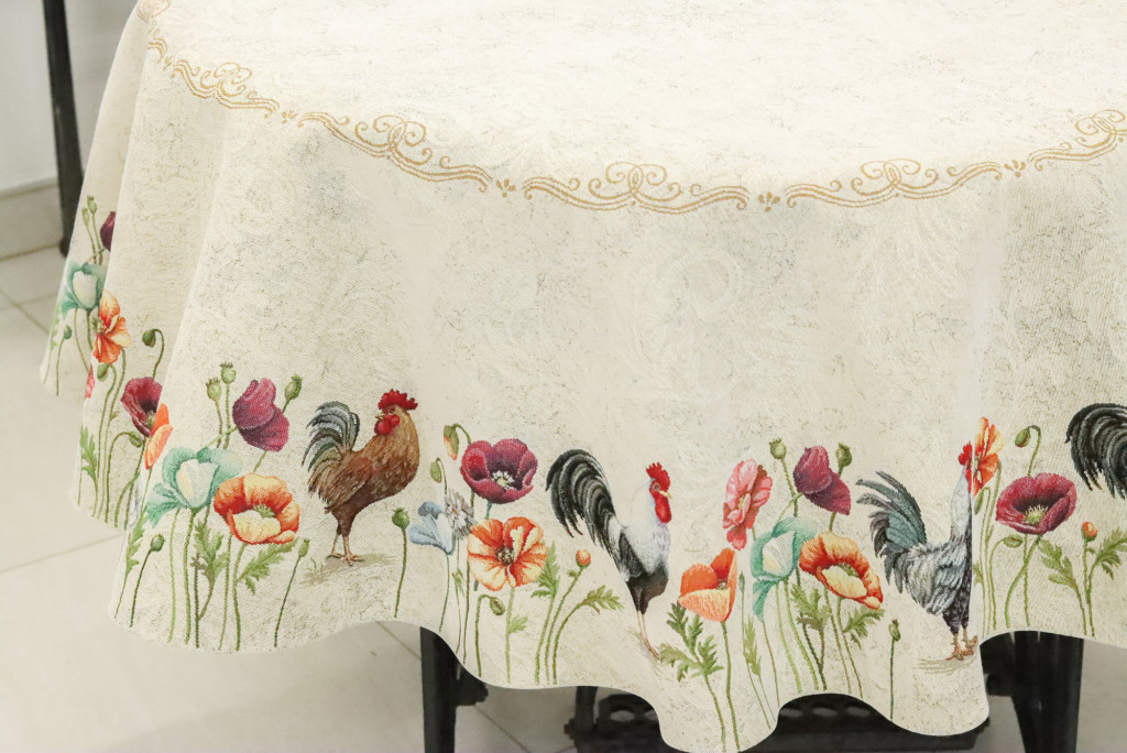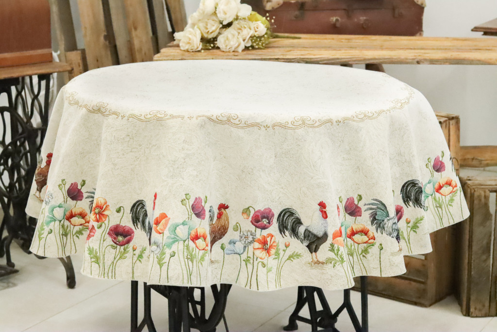 Country stílusú, kakasos, virágos asztalterítő a vidéki hangulat kedvelőinek. Stílusos lakáskiegészítő, amely hosszú éveken át megőrzi színét és minőségét. Keresd a többi kakasos terítőt és párnát a webshopban!