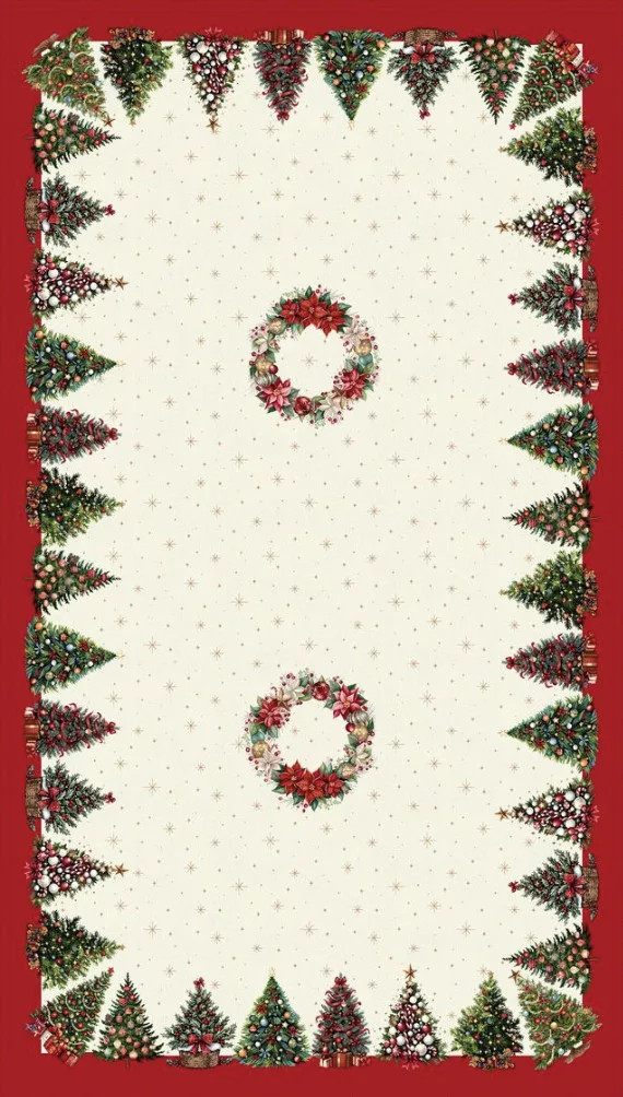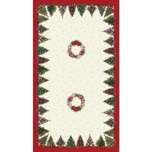 Varázsold ünnepivé az asztalterítést ezzel a karácsonyfás asztalterítővel, amelyet fényesen csillogó arany lurex szálak tesznek igazán ünnepélyessé. A terítő közepén egy gyönyörű fenyőtobozokból, bogyókból és örökzöld ágakból álló koszorú kapott helyet, a széleken pedig díszes karácsonyfák, szalagok és ünnepi dekorációk díszítik. A finom textúra és a prémium minőségű anyag hozzájárul a luxus megjelenéshez, amely bármilyen ünnepi asztalt feldob, legyen szó családi vacsoráról vagy baráti összejövetelről. Ideális választás azok számára, akik szeretnék egyedi és elegáns módon díszíteni asztalukat az ünnepek alatt.