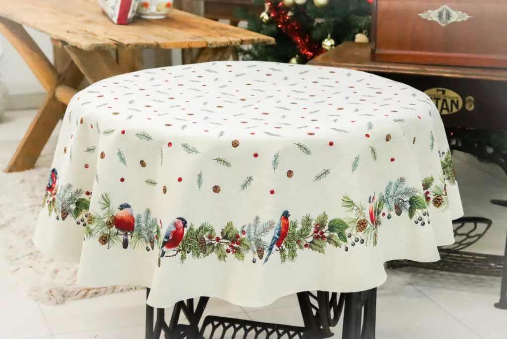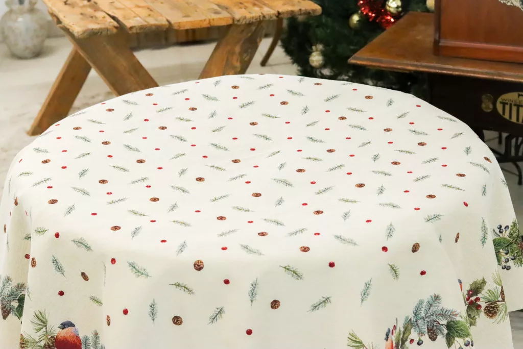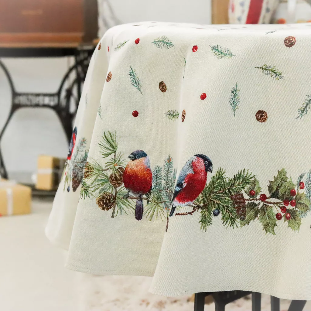 Kismadarak fenyőágon asztalterítő. Egyedülálló szépsége minden tekintetet az asztalra vonz. Lepd meg magad vagy szeretteidet egy prémium minőségű asztalterítővel!