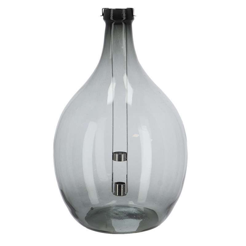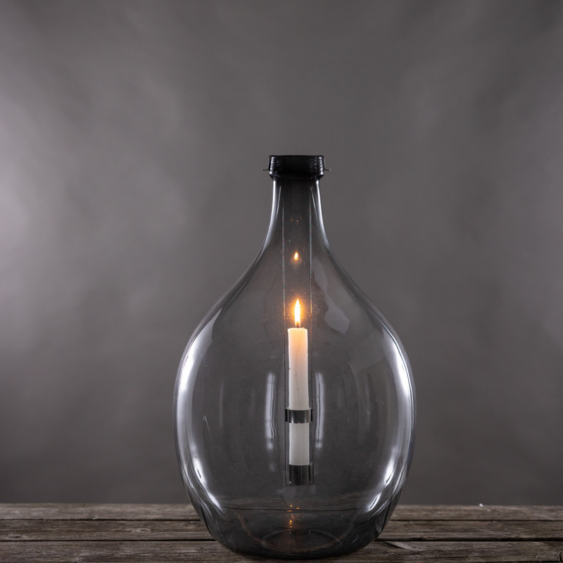 Lámpás újrahasznosított üvegből, kivehető gyertyatartóval, C változat, 51 cm magas. Stílusos lakberendezési kiegészítő, mellyel azonnal különleges atmoszférát teremthetünk otthonunkban. A finoman színezett, öblös üvegpalackban pislákoló gyertyafény azonnal otthonos hangulatot varázsol minden helyiségben. A gyertyát a kivehető fém gyertyatartóba kényelmesen belehelyezhetjük, majd meggyújthatjuk. A gyertyaláng a gyertyát az üvegebe visszahelyezve szélben sem alszik el. A biztonságról és a gyertya stabilitásáról plusz rögzítőgyűrű gondoskodik. Tippünk: kombináljuk a különböző magasságú, formájú és színű üveglámpásokat bátran egymással!