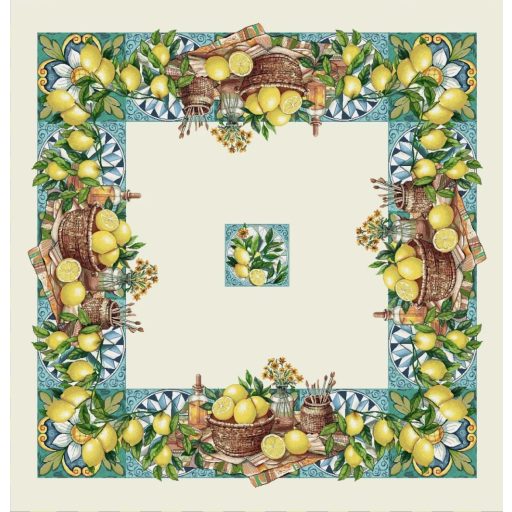 Dobd fel otthonod hangulatát ezzel a gépi szövésű gobelin asztalterítő, amely a mediterrán vidékek meleg nyugalmát idézi. A terítő mintáján napfényes citromokkal teli kosár, fonott tárolók, virágcsokor és rusztikus konyhai kellékek jelennek meg egy színpompás, kék-fehér spanyol csempemintás keretben. A részletgazdag, meleg színvilágú design tökéletesen passzol természetes anyagokhoz, rusztikus, provence-i vagy mediterrán stílusú berendezéshez.