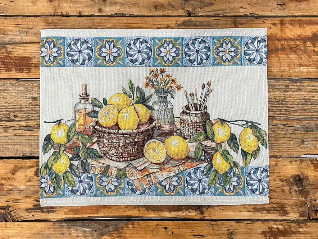 Mediterrán hangulatú gépi szövésű gobelin tányéralátét rusztikus, citromos mintával. Tökéletes nyári, mediterrán enteriőrökhöz.