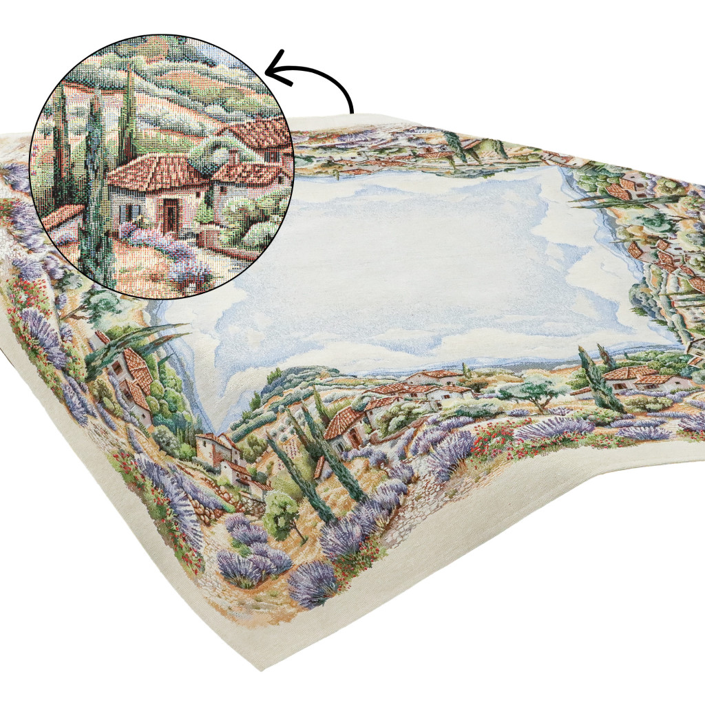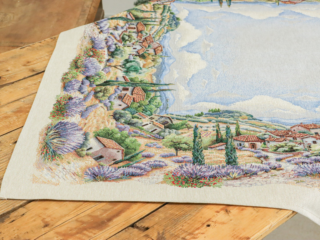 Ez a különleges spanyol gobelin asztalterítő a klasszikus gobelin stílust ötvözi a modern, precíz gépi szövési technológiával. A festői francia táj, levendulamezők és bájos vidéki házak részletgazdag mintái harmonikus, természetközeli és romantikus hangulatot visznek az asztali dekorációba.