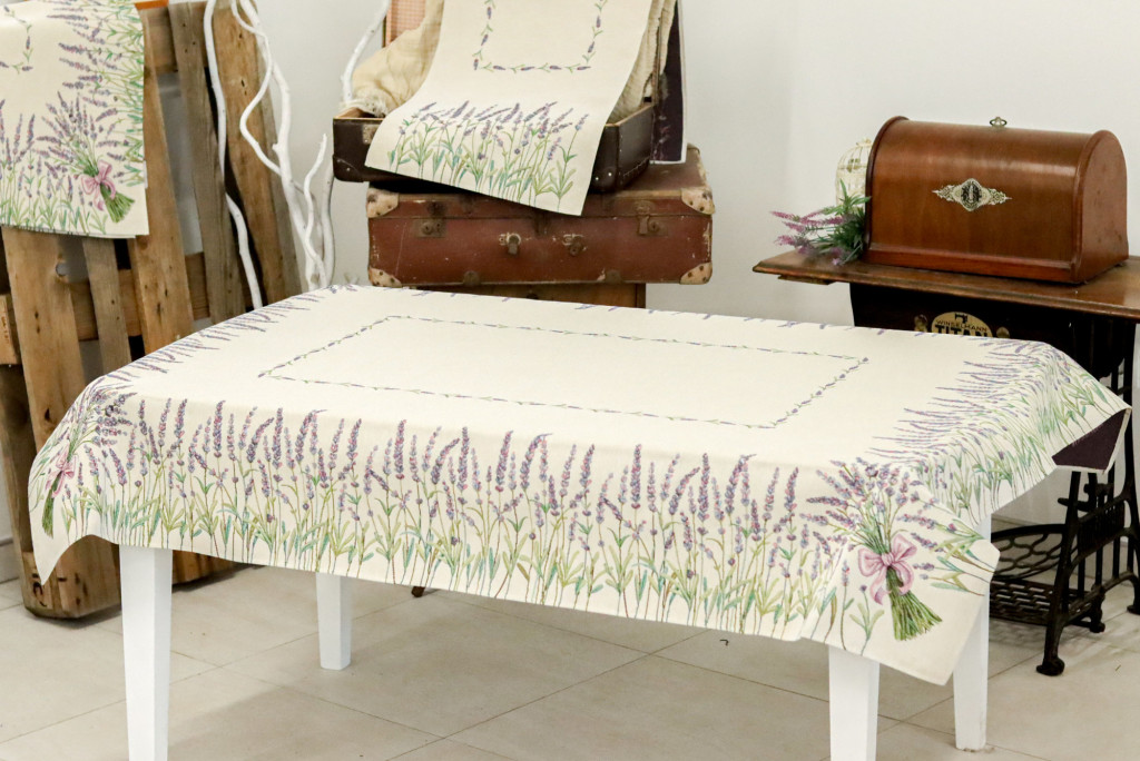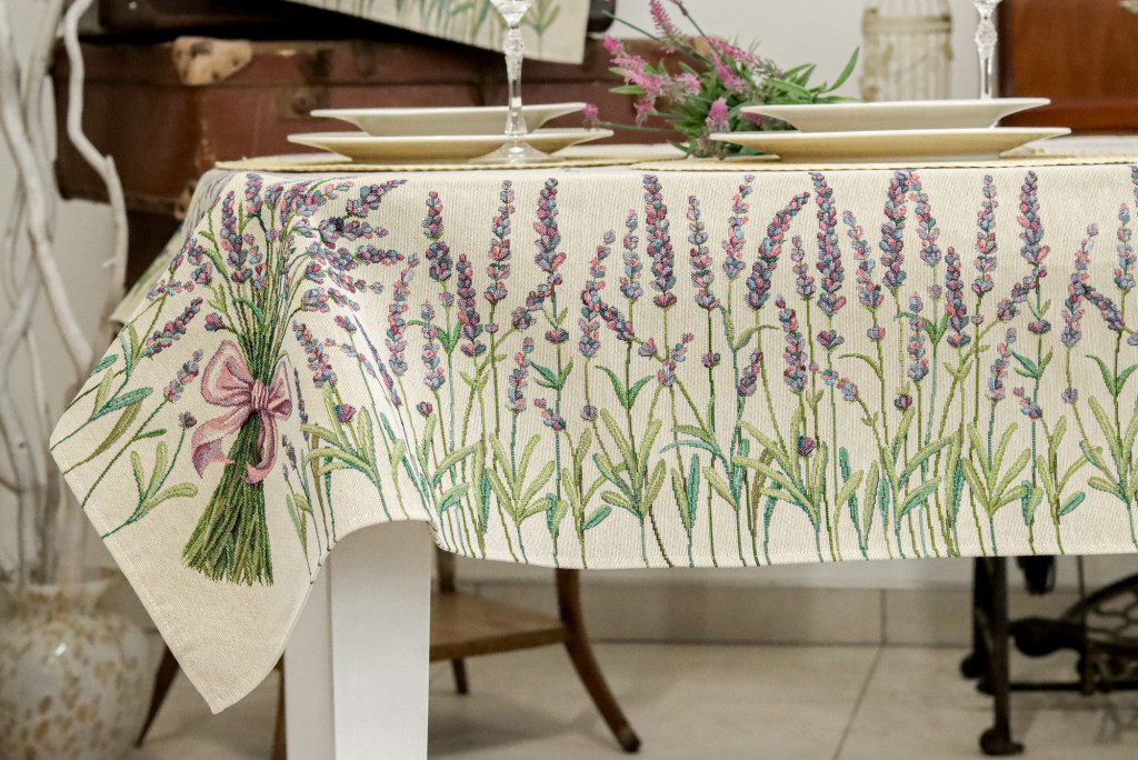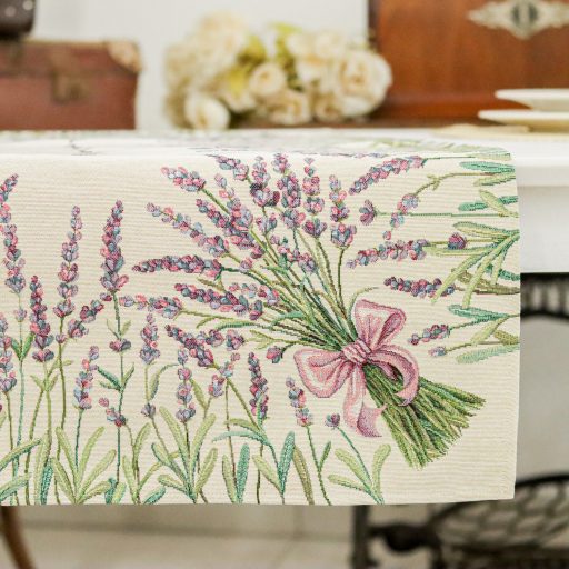Levendulával dekorált gépi gobelin asztalterítő, amely a megfelelő kezelés mellett hosszú éveken át megőrzi színét és minőségét.