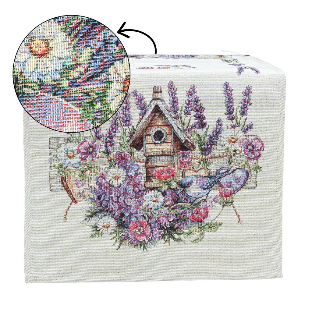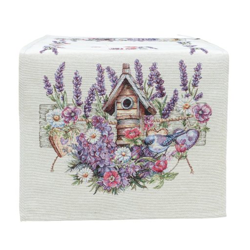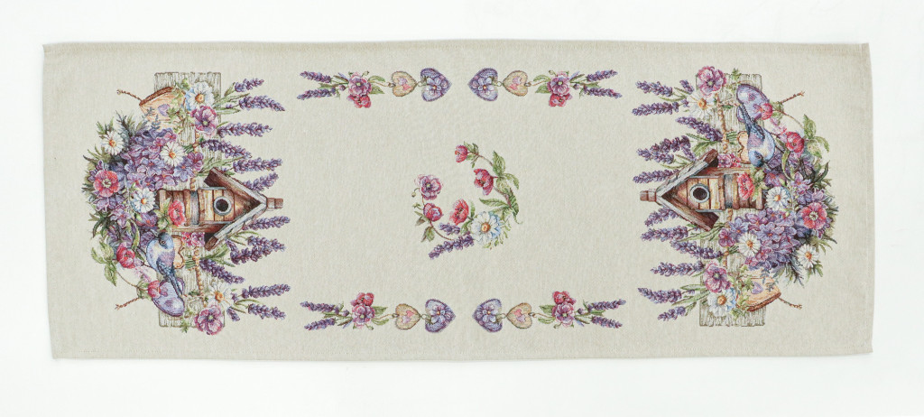 Spanyol gobelin asztali futó – levendulás, madárkás, romantikus mintával