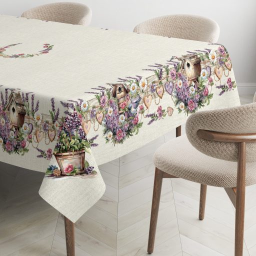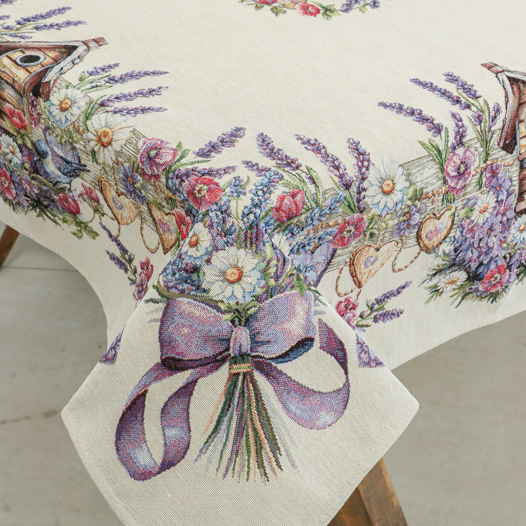 Ez a különleges spanyol gobelin asztalterítő a klasszikus gobelin stílust ötvözi a modern, precíz gépi szövési technológiával. A részletgazdag minta gazdag levendulavirág-kompozíciót, vadvirágokat, masnis és szívecskés díszítőelemeket, madárkákat és rusztikus madáretetőket ábrázol, amelyek harmonikus, természetközeli és romantikus hangulatot visznek az asztali dekorációba.