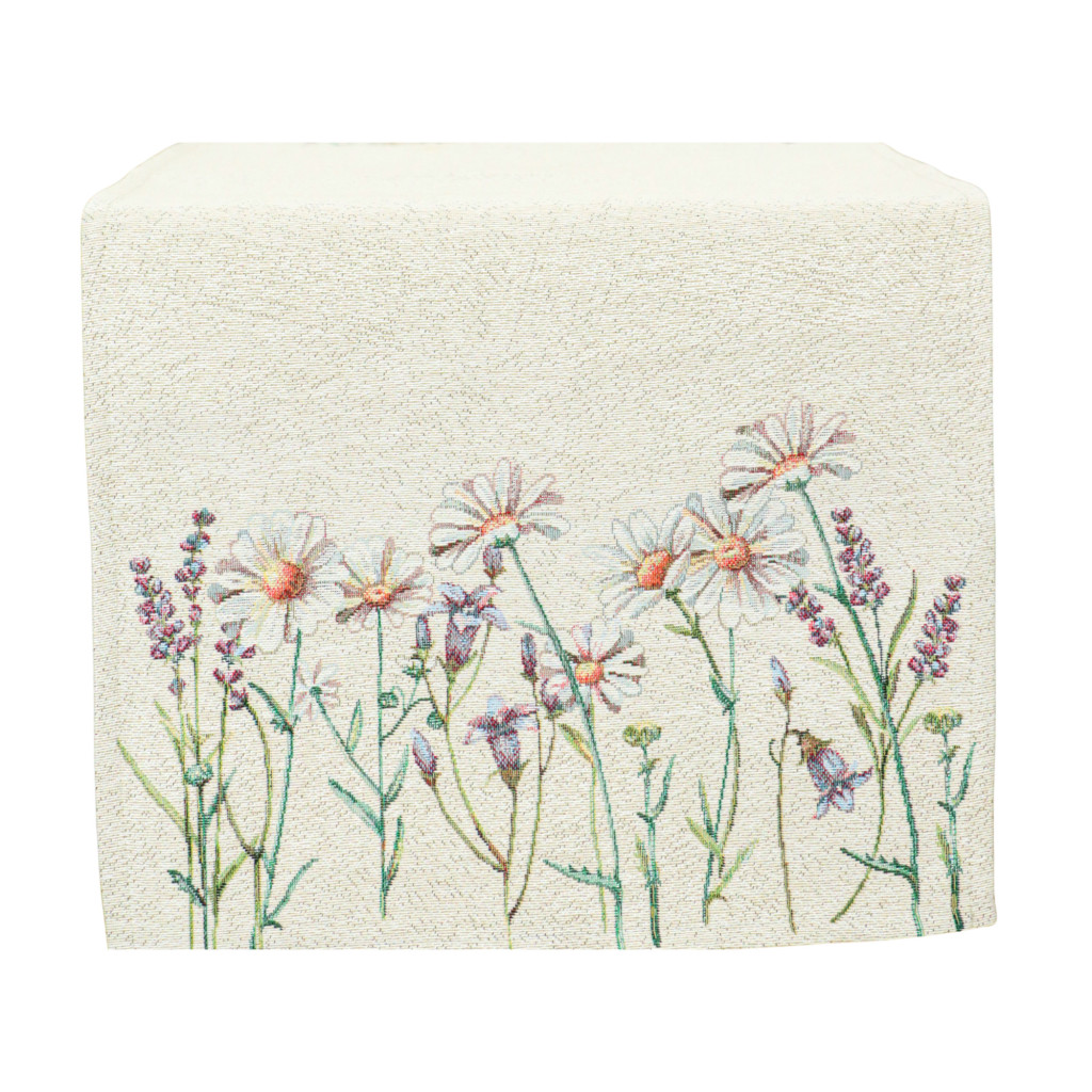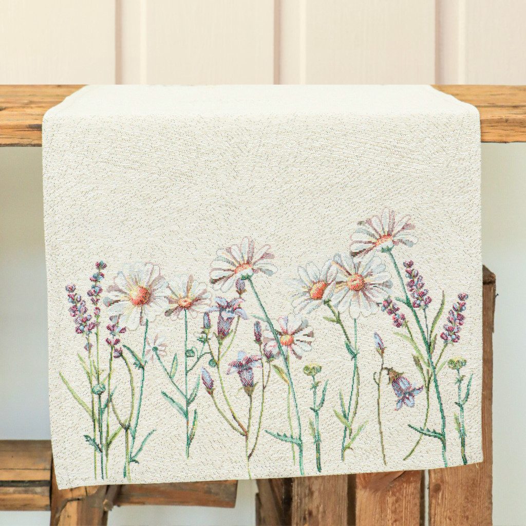 Levendulákkal és margarétákkal dekorált gépi gobelin asztali futó, amely a megfelelő kezelés mellett hosszú éveken át megőrzi színét és minőségét.
