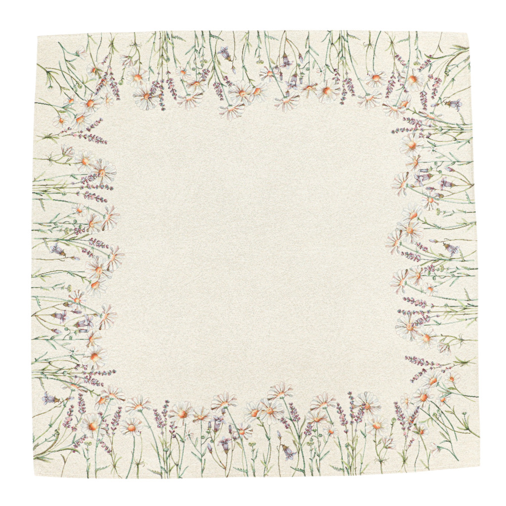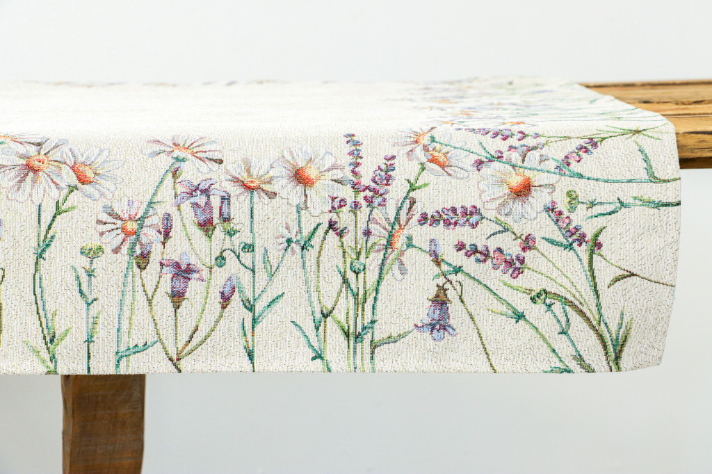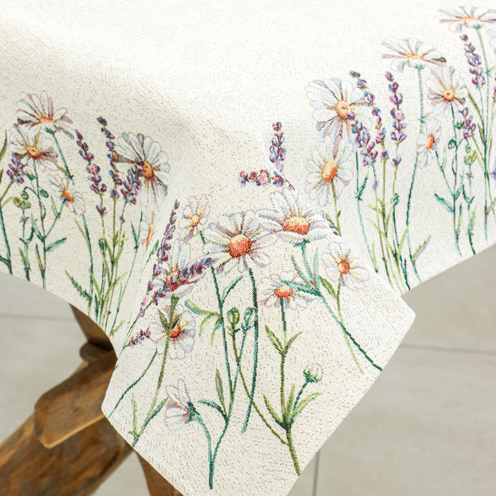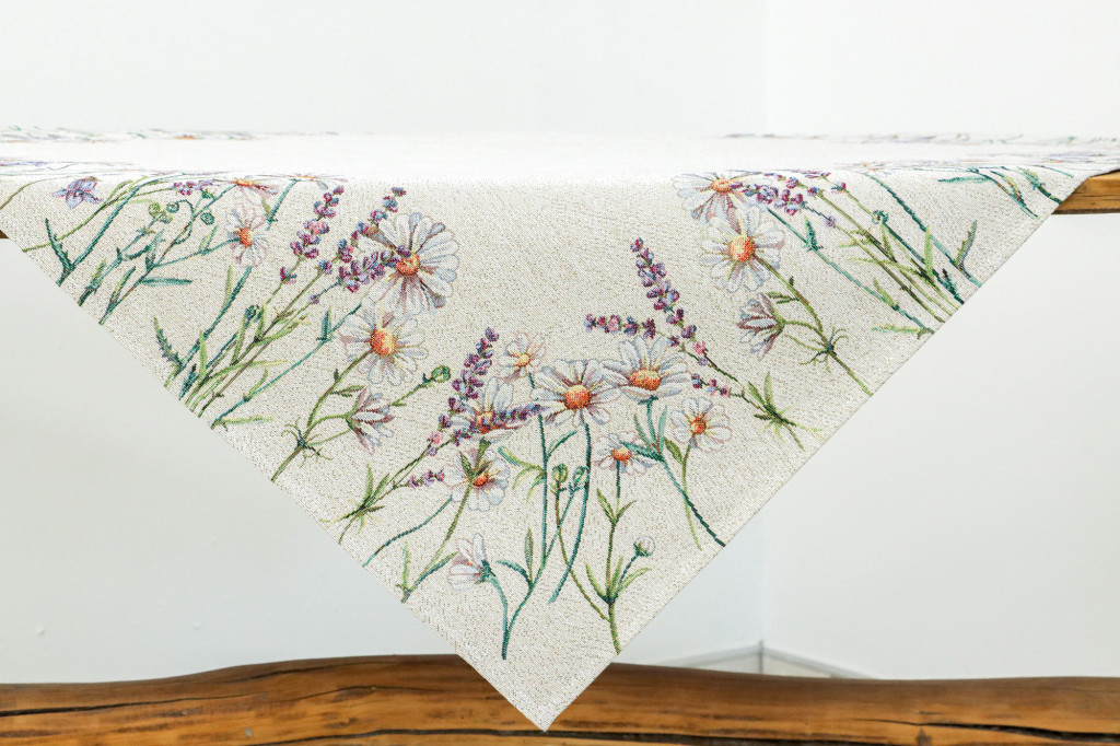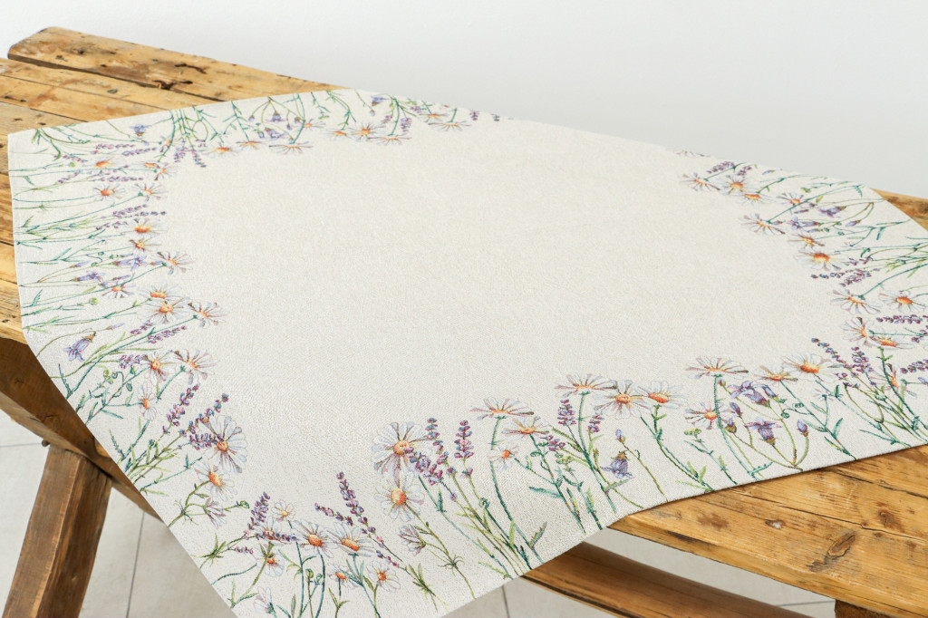 Margarétákkal, levendulákkal dekorált prémium minőségű, vastag anyagból készült gépi gobelin terítő. Származási hely: Spanyolország