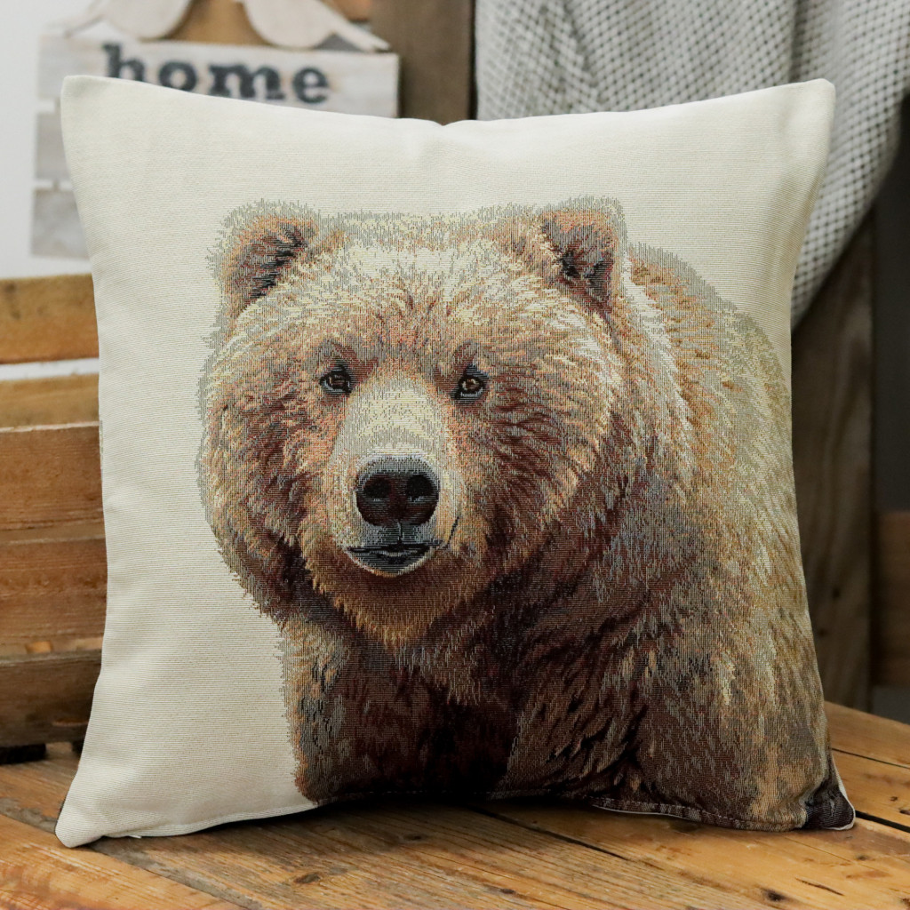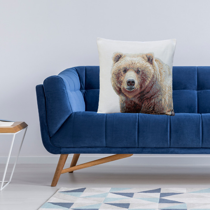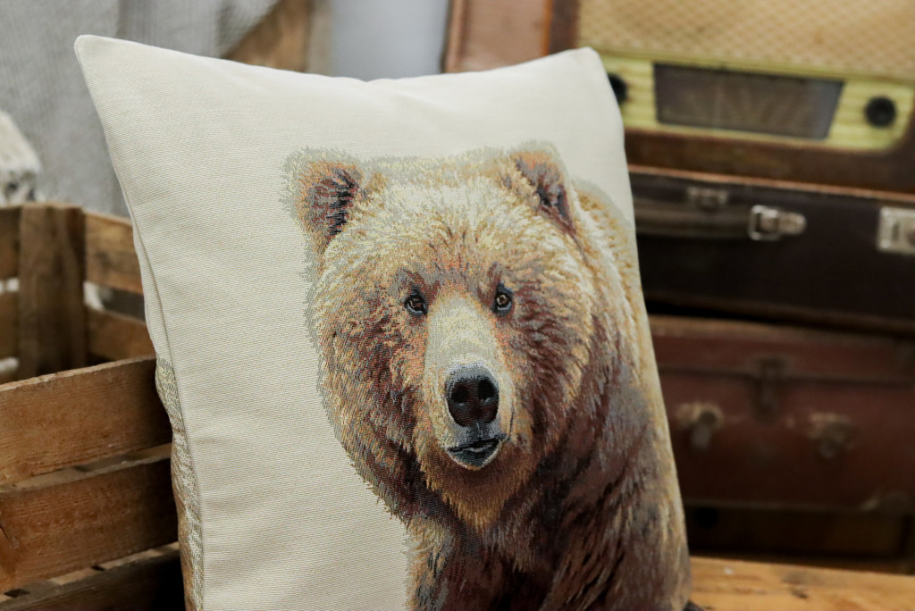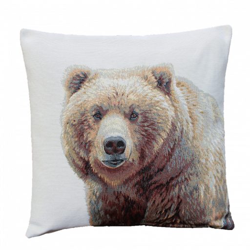 Medvét ábrázoló gépi gobelin párnahuzat, melynek mindkét oldalán a minta megtalálható. Kiváló ajándék lehet az erdő és az állatvilág kedvelőinek vagy aki az otthonát egy egyedi párnával tenné még különlegesebbé.