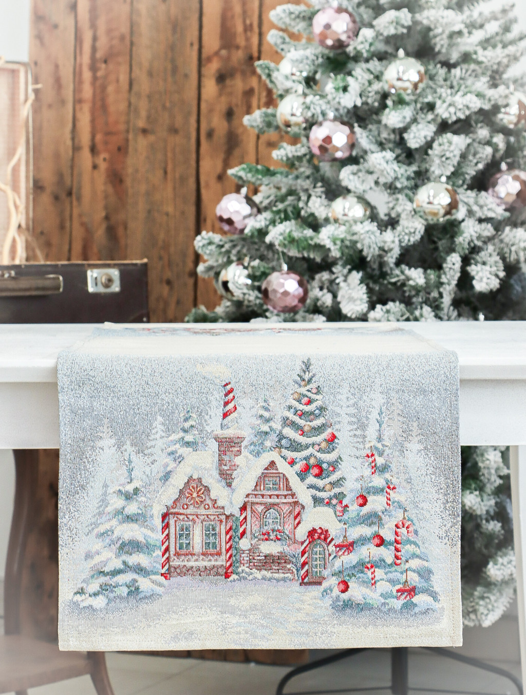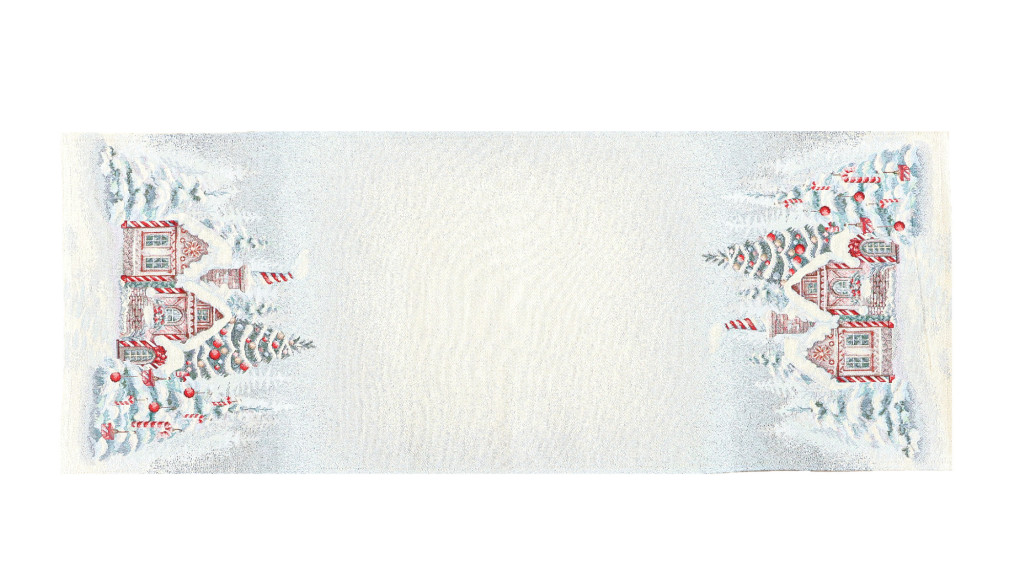 Varázsold ünnepivé az asztalterítést ezzel a különleges asztali futóval, amelyet fényesen csillogó ezüst lurex szálak tesznek igazán ünnepélyessé. A futó két végén részletgazdag mézeskalács házikó díszlik havas fenyőkkel és piros-fehér cukorpálcákkal körülvéve, míg a háttér finom, szürkés-ezüst árnyalatokban csillog. Használható étkezőasztalon, komódon, dohányzóasztalon vagy ünnepi dekorációként bármely helyiségben.