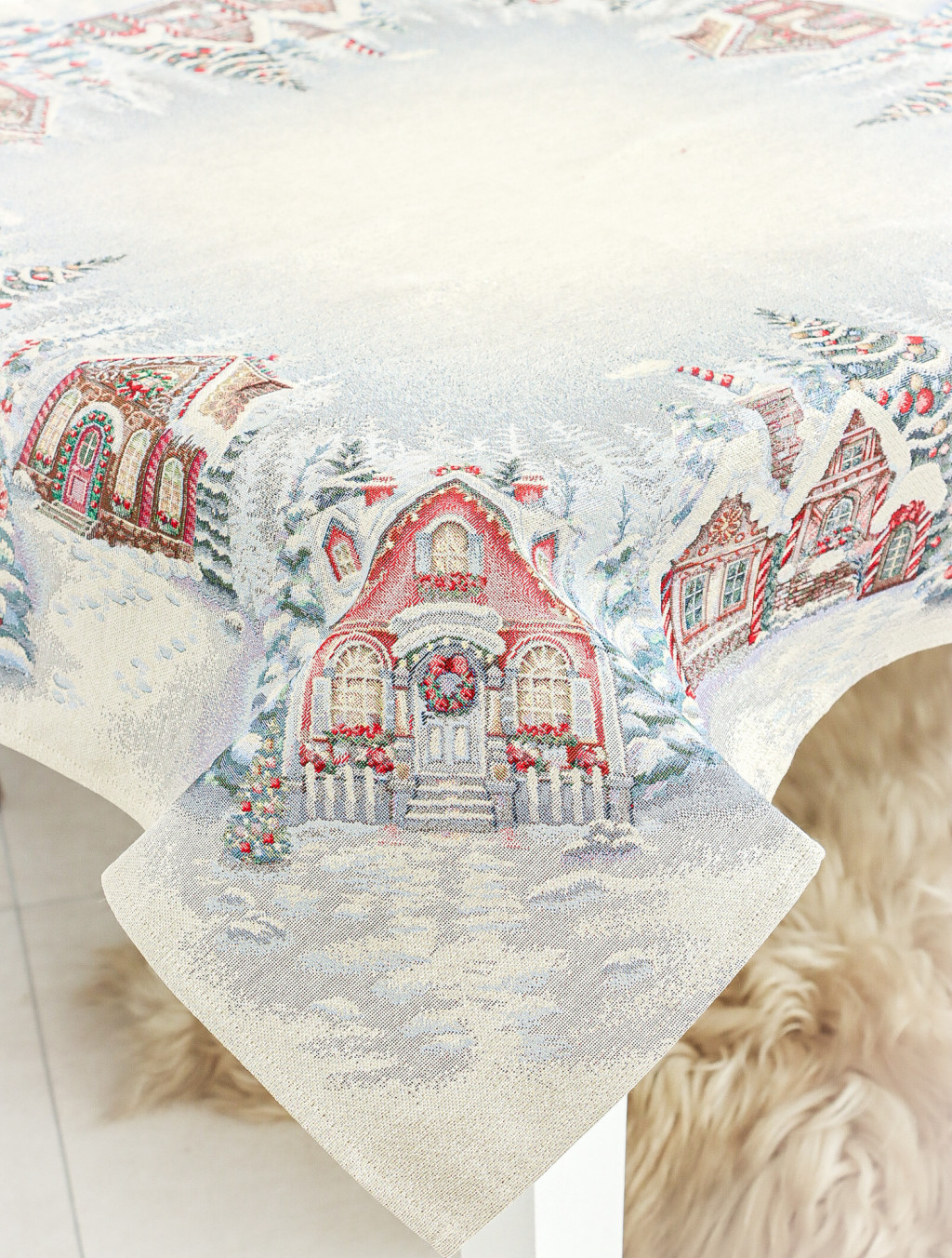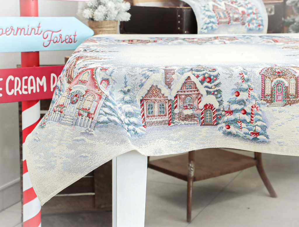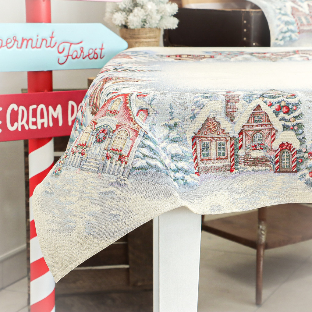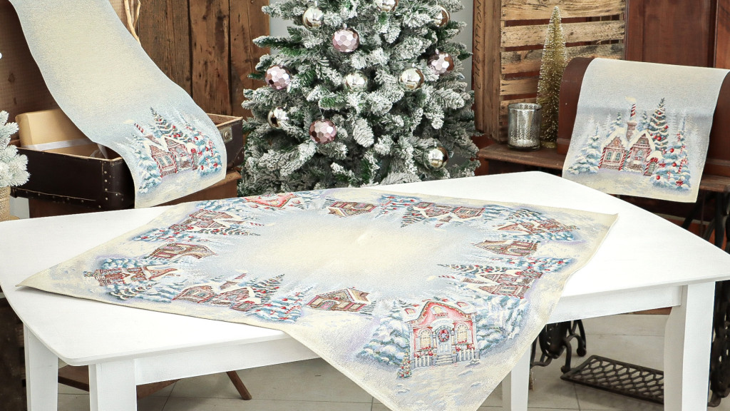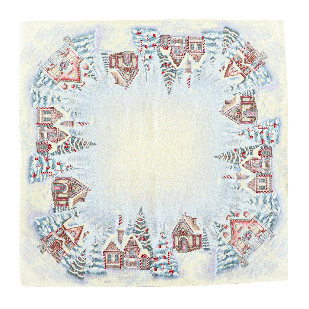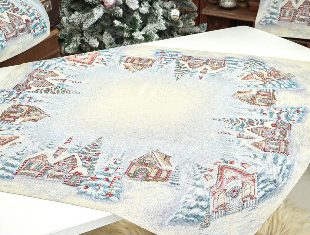 Ünnepi asztalterítő mézeskalács házikókkal dekorálva. Anyaga prémium minőségű gépi gobelin, amelyet ezüst lurexes szövés tesz még különlegesebbé.
