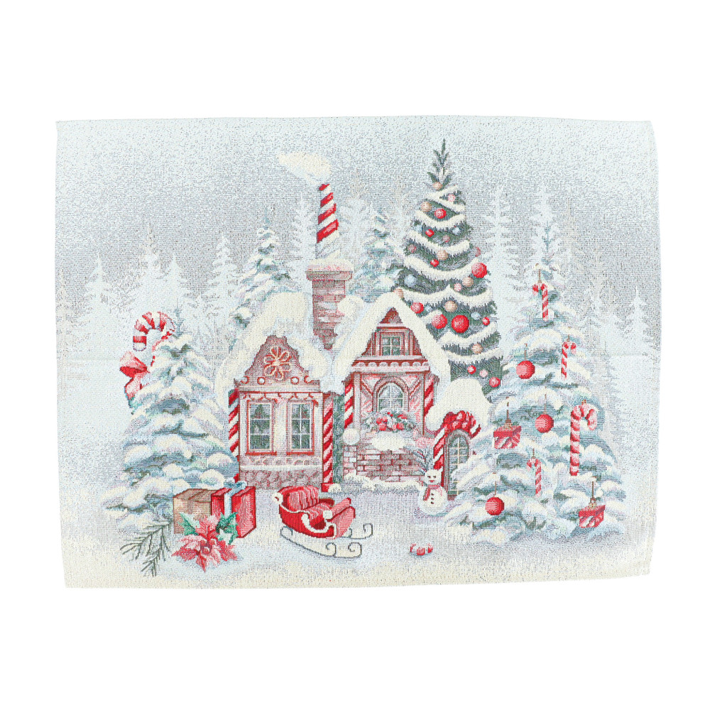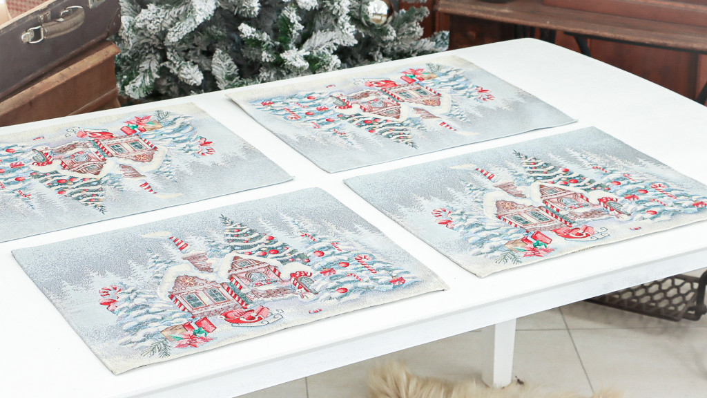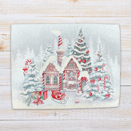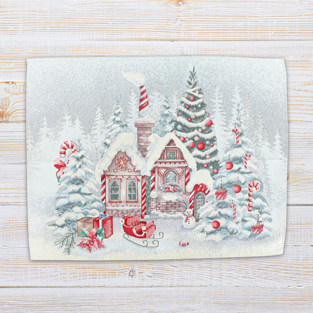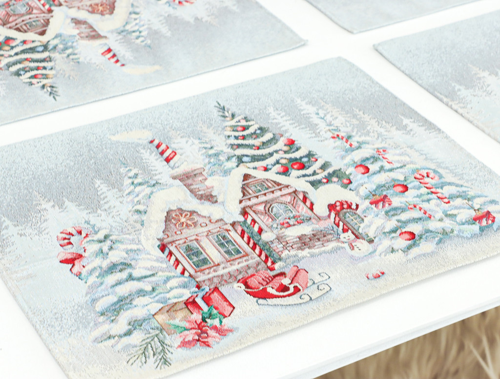 Prémium minőségű spanyol gépi gobelin tányéralátét, havas mézeskalács mintával, ezüst lurexes csillogással.