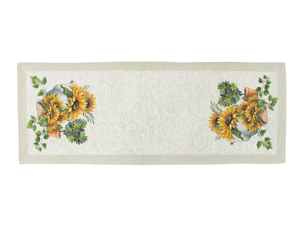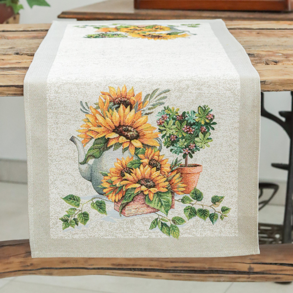 Napraforgókkal dekorált gépi gobelin asztali futó, amely a megfelelő kezelés mellett hosszú éveken át megőrzi színét és minőségét.